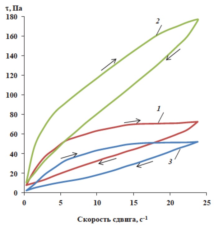 После термообработки нефти при 20 и 60 °С кривые прямого и обратного хода сближаются, скорости разрушения и восстановления тиксотропной структуры выравниваются (рис. 2, 1, 3). Термостатируемая при 40 °С нефть характеризуется максимальной по площади петлей (рис. 2, 2).
