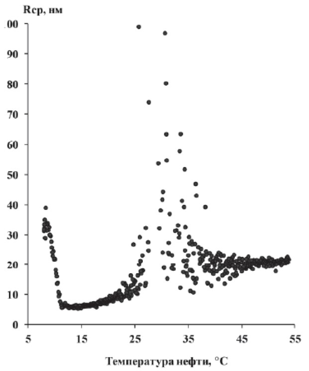 Наряду с традиционными методами исследований нефтей особое значение в настоящее время приобретают спектральные методы, позволяющие связать физико-химическую природу процессов структурообразования НДС со структурно-реологическими свойствами. Однако все известные спектральные методы определения размеров прозрачных частиц дисперсной системы в светлых нефтепродуктах по рассеиванию света различной длины не применимы к темным нефтепродуктам, каковыми являются большинство нефтей, так как в таких системах преобладает поглощение, а не рассеивание фотонов частицами [22]. Динамическое рассеяния света (ДРС) – это метод, использующий явление рассеяния света и предназначенный для измерения размеров нано- и субмикронных дисперсных частиц. В работе с помощью метода ДРС были получены данные по средним размерам радиусов нефтяных агрегатов, формирующихся в НДС при охлаждении от 55 °С до температуры, близкой к Тз (рис. 4). Скорость охлаждения нефти составила 0,04 °/мин. С понижением температуры образца от 55 до 35 °С существенных изменений значений средних радиусов нефтяных агрегатов не наблюдается (Rср=29,5–17,8 нм), после чего при дальнейшем охлаждении до 28 °С их размеры резко возрастают до 100 нм. Последующее понижение температуры нефти приводит к снижению Rср до минимальных размеров. И только при температуре, близкой к Тз, размеры агрегатов вновь растут в 3–8 раз.