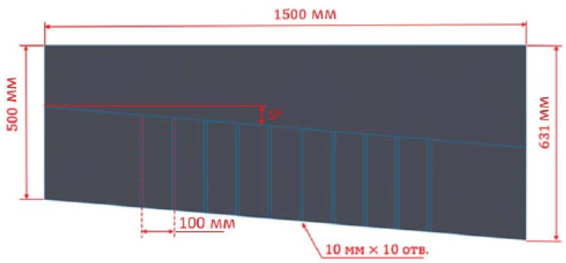В табл. 5 представлена температура газа на выходе из каналов (нумерация слева направо от 1 до 10), а на рис. 10 – зависимость средней температуры газа на выходе из канала от скорости его подачи в перфорированный под. Горизонтальной линией указана температура в 500 °С, при которой начинается интенсивное разложение метана на углерод и водород [28]. Нагрев природного газа выше этой температуры приведёт к зарастанию каналов сажевыми частицами.