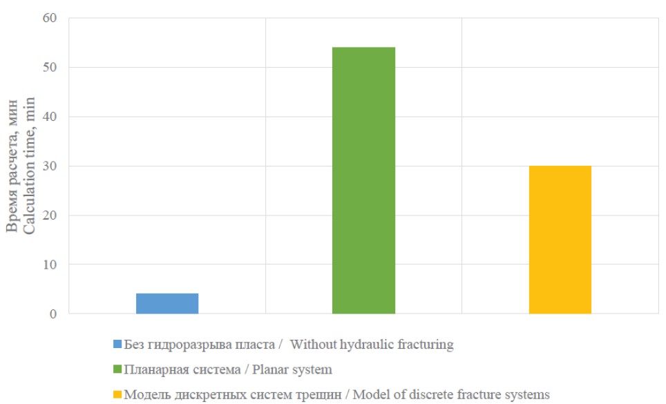 Выполнено моделирование многостадийного гидроразрыва пласта с использованием двух различных моделей трещин: планарной системы трещин и модели дискретных трещин. Получены сопоставимые уровни добычи. Время расчета также находится на сопоставимом уровне. Преимуществом модели дискретных систем трещин является возможность учета произвольного направления задания трещин по результатам дополнительных специализированных исследований.