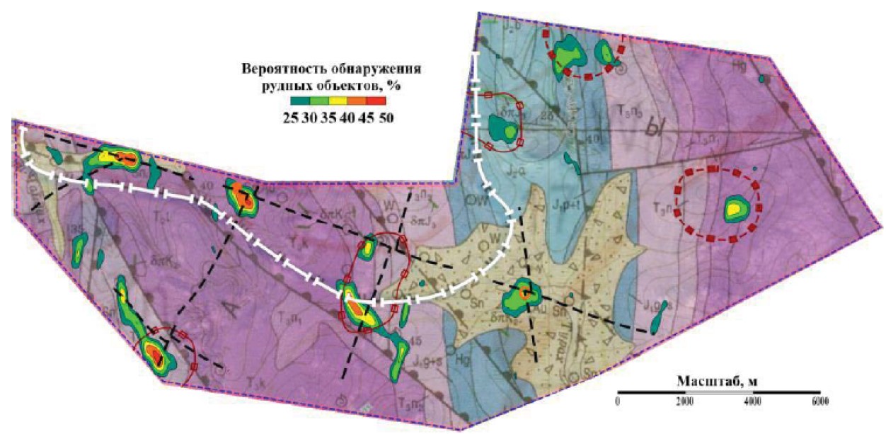 Fig. 5. Combination of promising areas, identified by extrapolation (brown contours) with probabilistic anomalies and the outline of polymetallic-tin ore region (white dotted line – according to [20]). Explanation to geological scheme is on Fig. 1, a. Extrapolation method is given on Fig. 2, d