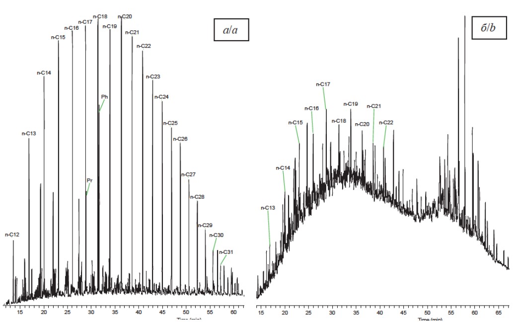 Анализ свойств исходных нефтей показал, что УН характеризуется повышенной плотностью относительно ЗН, а вязкость УН в 5 раз выше, чем у ЗН. Существенные различия физико-химических свойств исходных нефтей определяются их составом. Результаты анализа состава масел методом хромато-масс-спектрометрии (рис. 1) позволяют отнести ЗН к метановому, а УН к нафтеновому типу нефти.