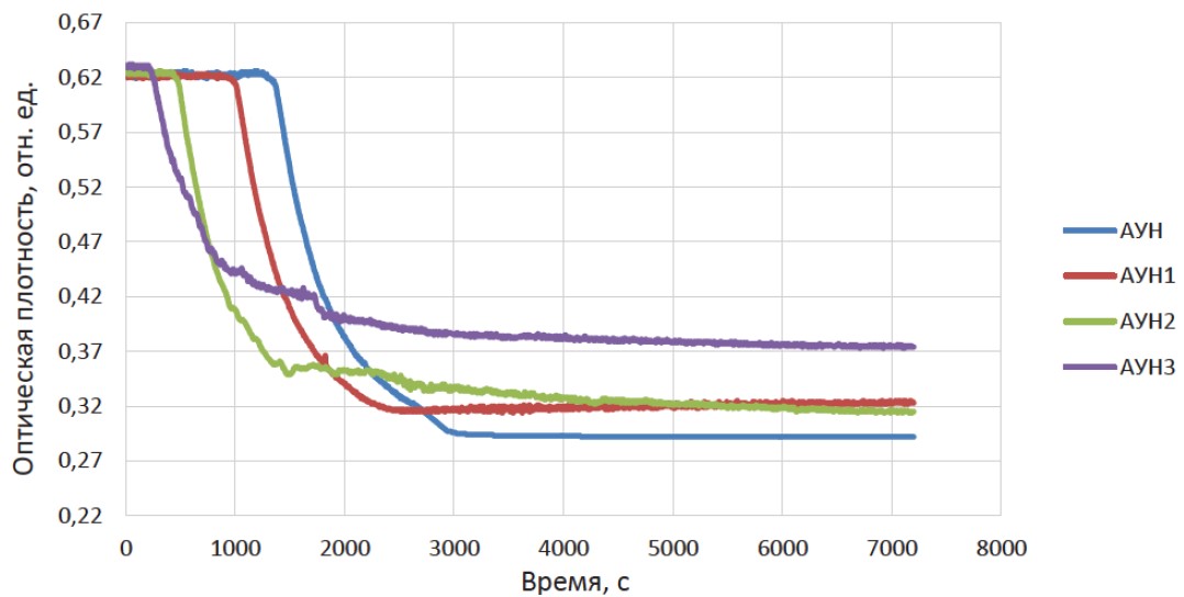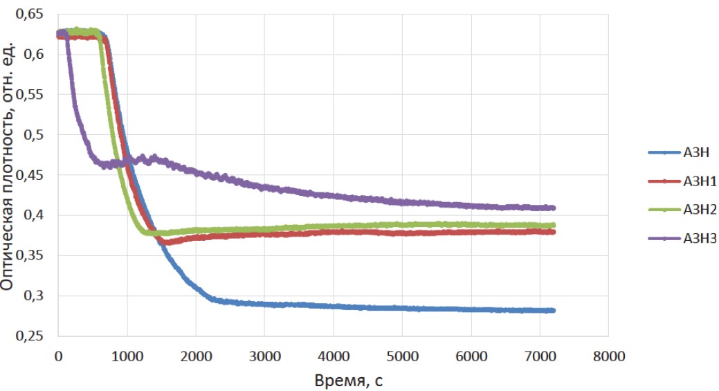 Агрегативная устойчивость асфальтенов оценивалась спектрофотометрическим методом с использованием прибора Perkin Elmer Lambda 950. Анализ проводился в течение 7200 с (шаг – 5 с). Толщина кюветы составляла 10 мм, длина волны – 620 нм. Раствор асфальтенов в хлороформе 0,1 мас. % смешивался в кювете с н-гексаном в соотношении 1:3, и анализ проводился по вышеописанному режиму.