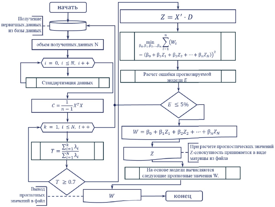 Затем строится регрессионная модель. В циклическом процессе проверяется ошибка модели E, которая рассчитывается на основе разности предсказанных и истинных значений. Если ошибка модели составляет менее 5 %, процесс считается завершенным и модель считается приемлемой для прогнозирования. Если ошибка больше заданного порога, параметры модели корректируются и расчет по данной модели повторяется. При повторном расчете используется Z-совокупность, содержащая факторы в виде матрицы размером n×m. Принятые данные вводятся в разработанную модель PCA, после чего вычисляются m следующих прогнозных значений W, и результат выводится в файл в виде матрицы размером 1×m.