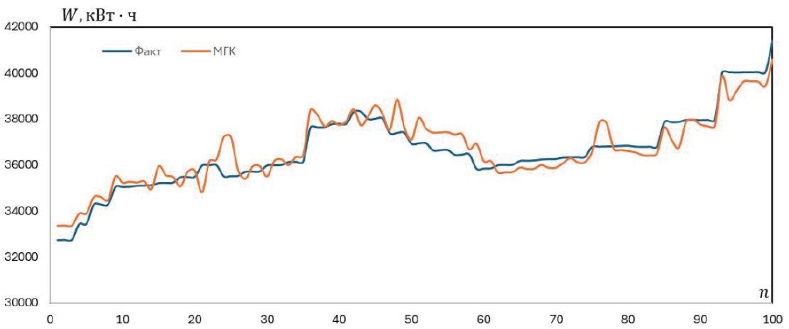 Рис. 2. Сравнение фактических и прогнозных величин электропотребления