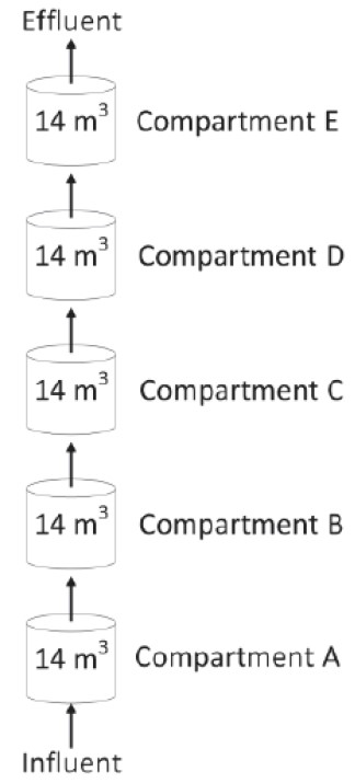 Plug-flow up-flow reactor was modelled following the method described in [22]. This entailed assuming that the reactor was subdivided into five compartments connected in series in which the lowest CSTR received fresh feed (compartment A), from which the compartment right above it was fed, and the third compartment was then fed from the second compartment, and so on and so forth (Fig. 1). The control of aeration in the plug-flow up-flow reactor was simulated based on the DO in the first compartment. Each of the five imaginary compartments was modelled as a CSTR [22]. It was assumed that the percentage oxygen drop per metre was 0.55 [23]. Process rates and differential equations in each compartment thus followed the form presented in (1)–(3).