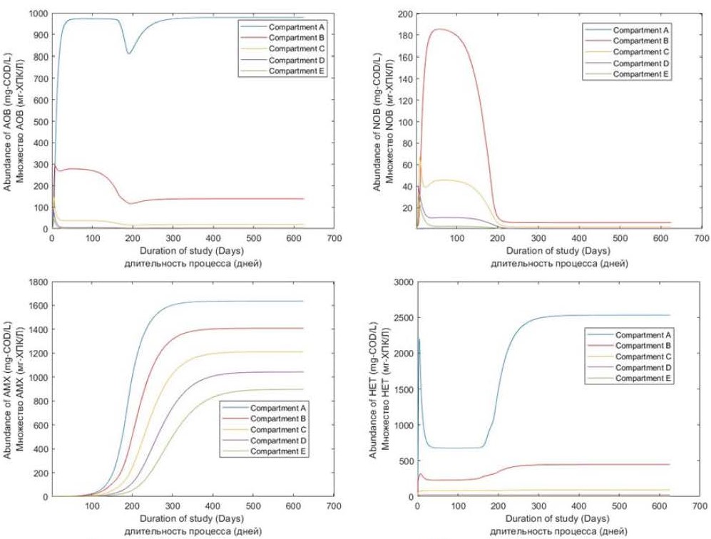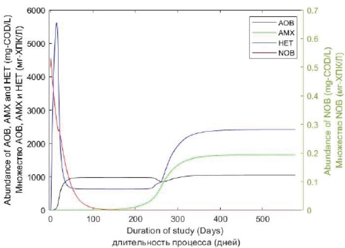 XAOB – abundance of AOB (mg-COD/L) (Множество AOB (мг-ХПК/л)); XNOB – abundance of NOB (mg-COD/L) (Множество NOB (мг-ХПК/л)); XAMX – abundance of AMX (mg-COD/L) (Множество AMX (мг-ХПК/л)); XHET – abundance of HET (mg-COD/L) (Множество HET (мг-ХПК/л))