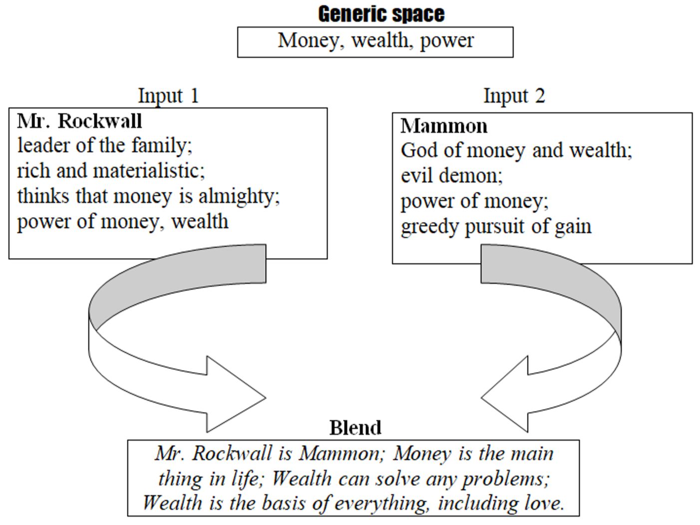 Mr. Rockwall thinks highly of materialism underestimating spiritual values and, in this extent, it can reasonably be claimed that Mr. Rockwall appears in the role of Mammon in the text. If the definitional meaning of the word “Mammon” is compared with the characteristic traits of Mr. Rockwall, alike lines can be drawn. In fact, the implicit integration between the character of Mr. Rockwall and the allusion of Mammon forms a conceptual blend and serve to reveal conceptual significance of the title from one side by now: