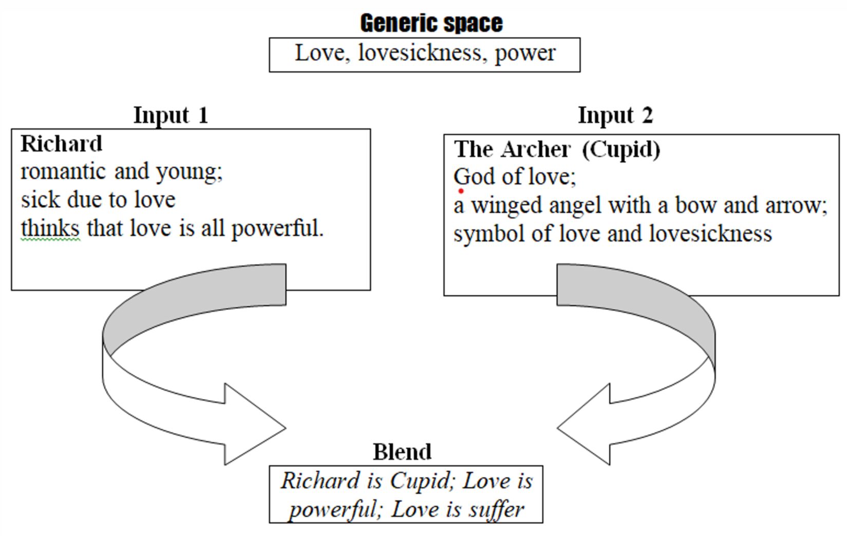 First, having activated mythological knowledge structures that assisted to remind of Cupid’s representation in myths, second, after getting to know that Richard does not take after his father and he is not in the same high thought of money and wealth like his father is, the main inference that can be deduced is the fact that Richard and Cupid, both symbolize the concept of LOVE and the blend that can be obtained from the integration of representational characteristic traits of these literary and mythological characters urges that it is love which is powerful and money cannot buy it.