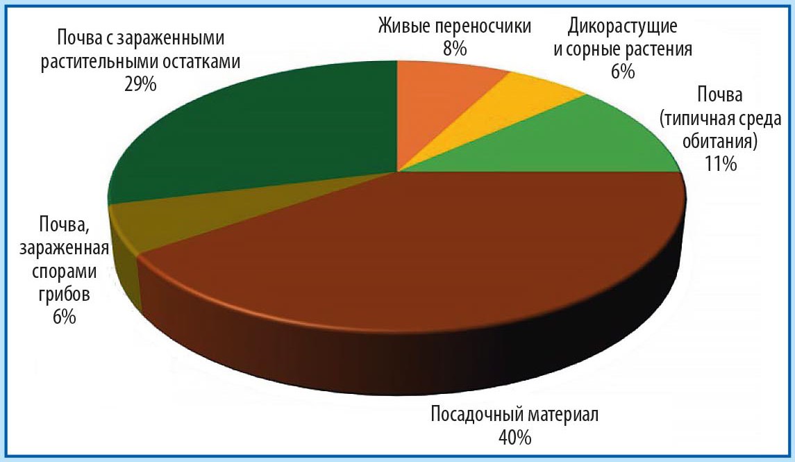 Рис. 2. Структура долевого распределения основных резервуаров инфекции, характерных для возбудителей инфекционных и паразитарных заболеваний картофеля