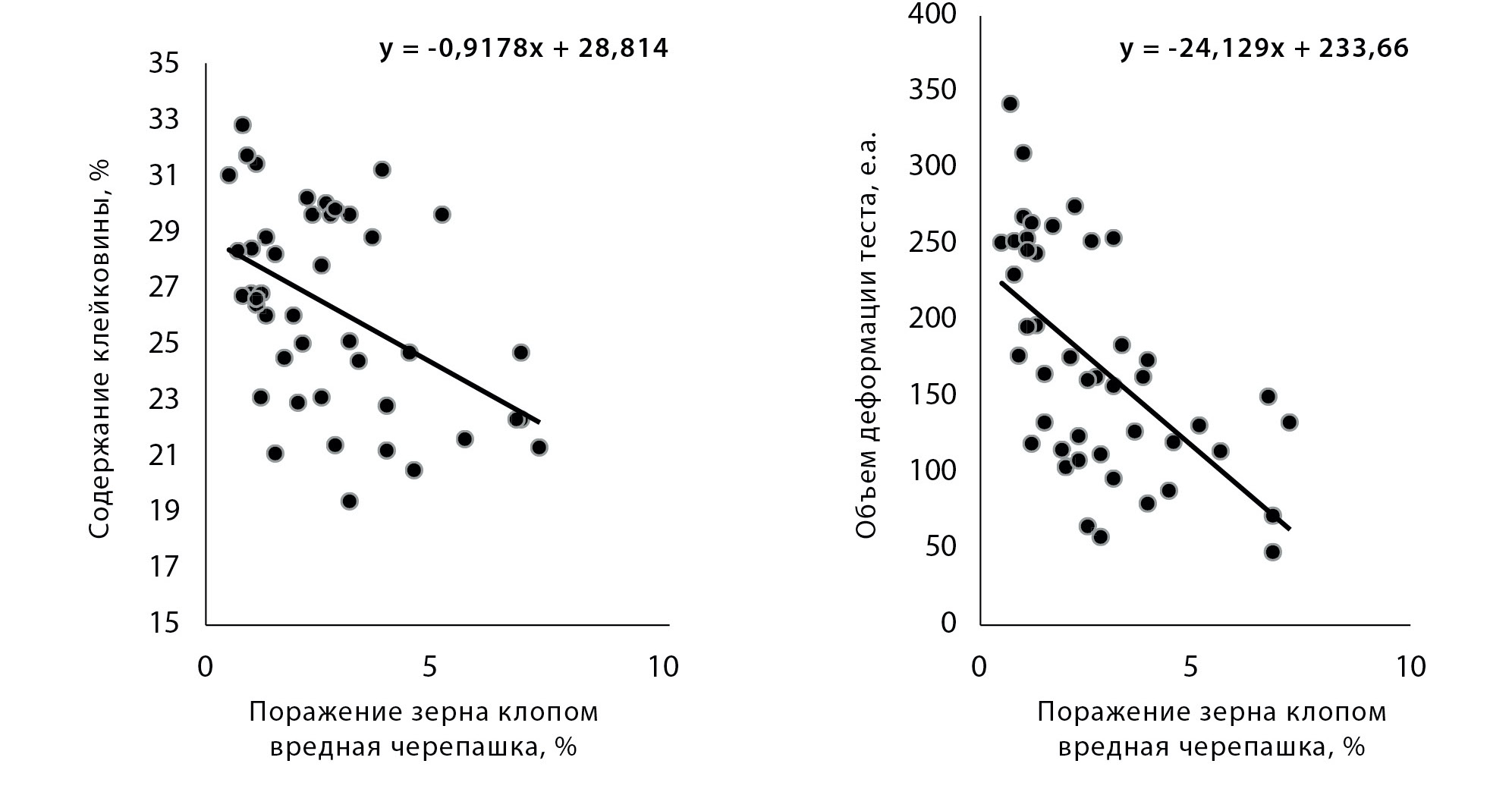 Степень повреждения клопом на содержание белка и клейковины оказывала неоднозначное влияние: от проявления отрицательных (r = –0,67) до значительных положительных (r = 0,85). Повреждения клопом не снижает количество клейковины, а изменяет ее качество (ИДК) и удельную работу деформации теста (сила муки).
