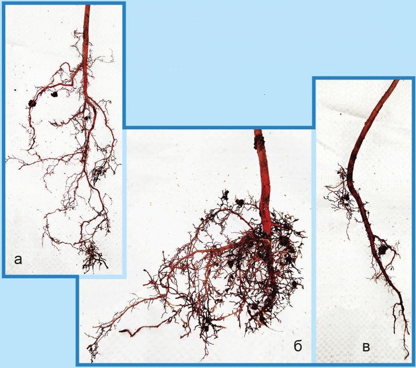 Рис. 2. Корневая система сеянца айвы обыкновенной по вариантам опыта: а – песок; б – мох-сфагнум; в – контроль.