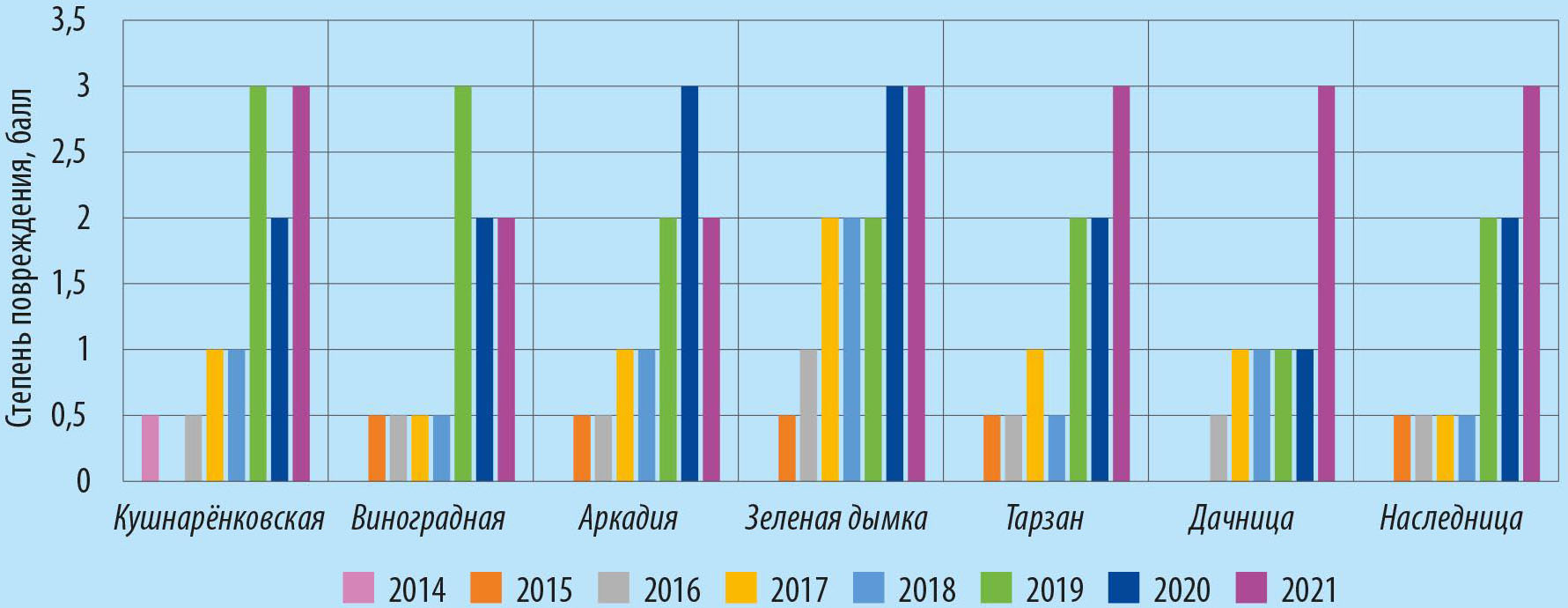 В группе слабоустойчивых сортообразцов с максимальной степенью повреждения 3,0 балла первые признаки выявлены уже на второй год после посадки у сорта Кушнарёнковская, третий – Виноградная, Аркадия, Зеленая дымка, Наследница, Тарзан (13,9%), четвертый (2016) – Дачница. У данных сортов (кроме Зеленой дымки) сохранялся невысокий уровень повреждения (0,5…1,0 балла) до 2019–2020 года (рис. 2, 4-я стр. обл.).