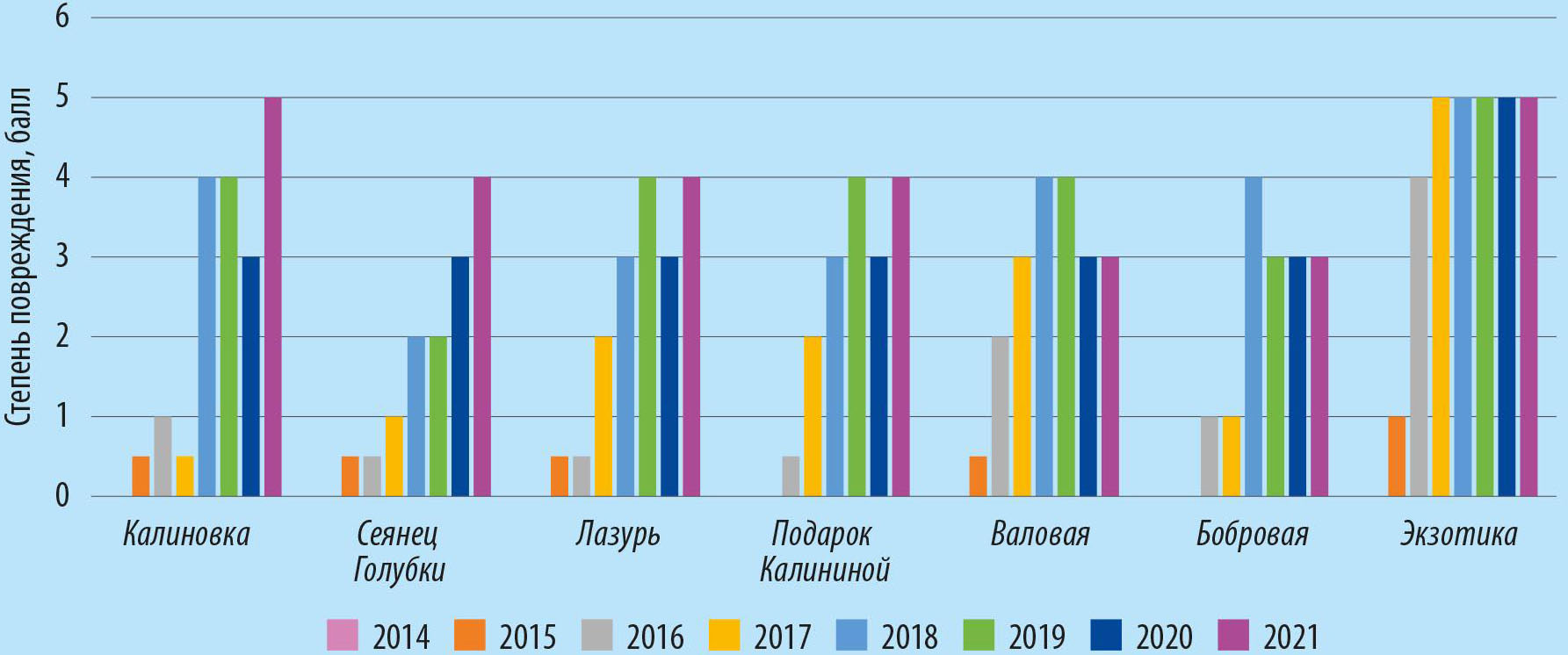 Выявлена различная степень повреждения смородины черной почковым клещом с 2014 по 2021 год. У сорта Александрина на протяжении всего времени наблюдения признаков повреждения вредителем не отмечено.