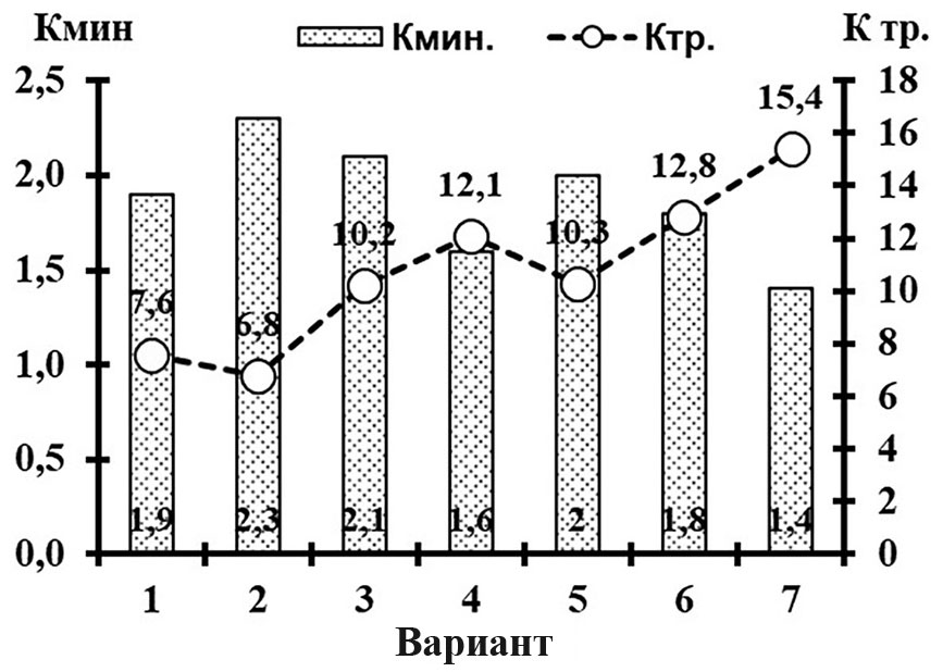 Примечание. * К мин. – коэффициент минерализации почвы, ** К тр. – коэффициент трансформации органических соединений.