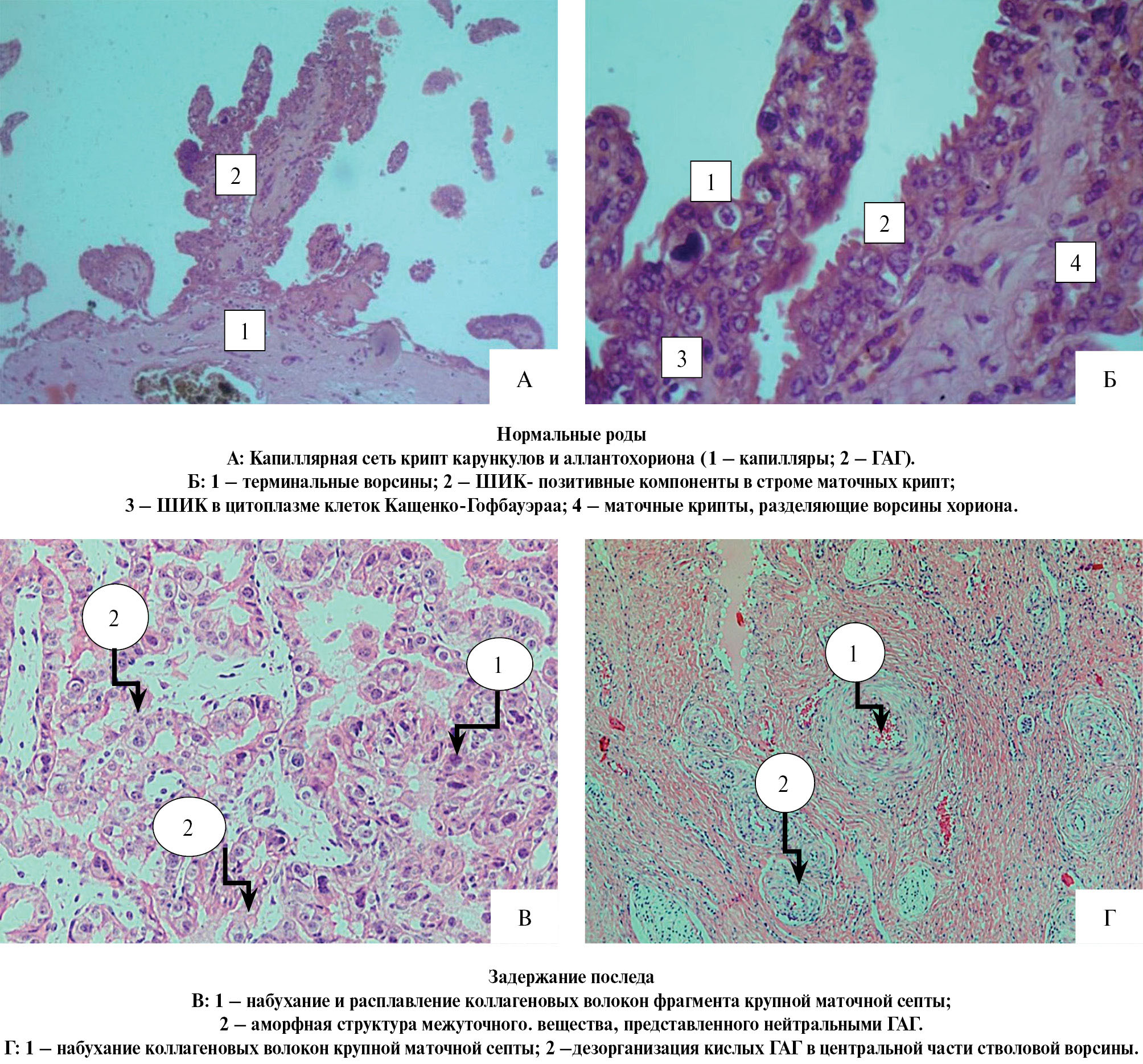При задержании последа в эпителиоцитах крипт карункулов на единицу площади материнской части плаценты было больше белковых субстанций и капилляров, по сравнению с нормальными родами. Маточный эпителий имеет кубическую форму, слущен, цитоплазма его светлее окрашивается (рис. 1).