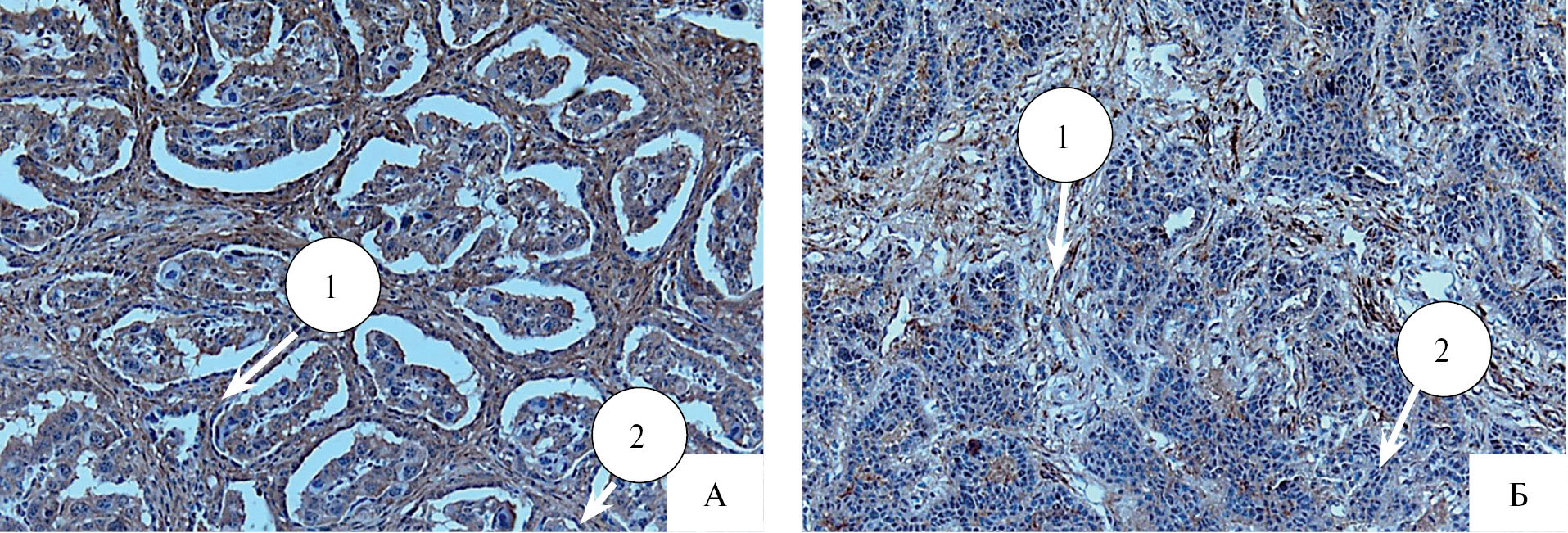 При окраске ворсин аллантохориона по Маллори отмечается диффузное тонкое фибриллярное окрашивание коллагена в составе крипт карункула и выраженное диффузное окрашивание ядерного материала клеточного компонента. Выявляется резкое цитоплазматическое набухание и вакуолизация эпителиальных клеток, субэпителиальный отек соединительной ткани. Иммунолокализация металлопротеиназы матриксной ММР-9 активно проявлялась в цитоплазме синцитиотрофобласта (1) и трофобласта (2), за исключением гигантских двуядерных клеток (рис. 5А). Слабовыраженная реакция MMP-9 отмечалась в цитоплазме эпителиоцитов крипт карункулов материнской части плаценты. Остаточное скопление данного типа металлопротеиназы было зафиксировано в деградируемых криптах (1) материнской части плаценты, а также вокруг сосудов (2) (рис. 5Б).