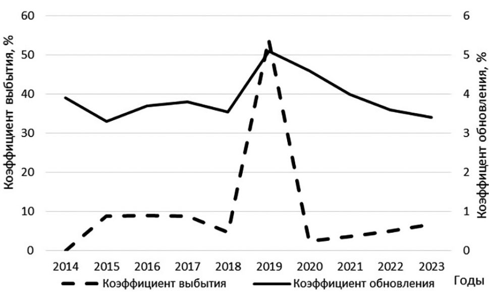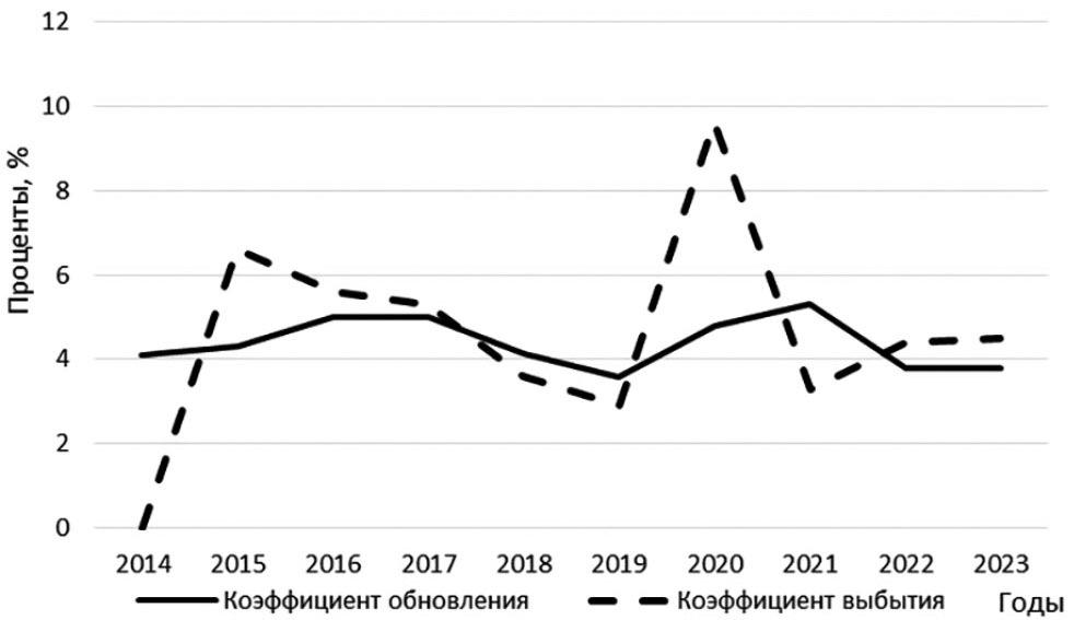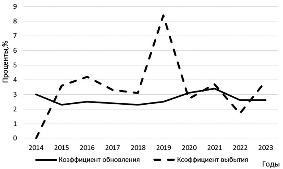 Рис. 1. Коэффициенты обновления, выбытия парка тракторов.