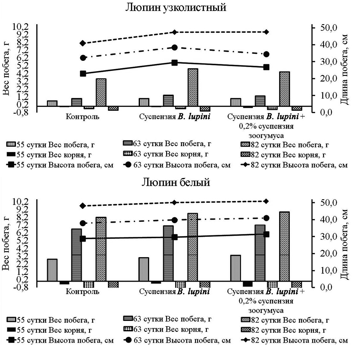 Оценка высоты побегов показала, что внесение зоогумуса и биопрепарата также инициировало линейный рост растений. Наибольшие показатели были на органо-микробном фоне. Под конец вегетации оба вида достигли высоты 50 см, что на 17% превышало значения контрольных растений люпина узколистного и 6% белого.
