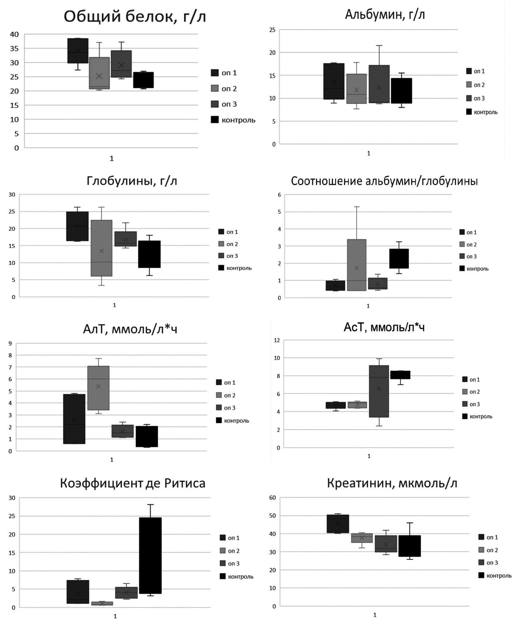 Параметры показателей сыворотки крови определяли на биохимическом полуавтоматическом анализаторе Photometer 5010V5+ (ROBERT RIELE GmbH & Co KG, Германия), содержание белковой фракции – с помощью реактивов, производимых АО «Вектор-Бест», (Новосибирская обл., Россия), концентрацию общего белка – биуретовым методом, альбуминов – бромкрезоловым. На основании полученных данных рассчитали глобулины и альбумин-глобулиновый коэффициент. Активность аланинаминотрансферазы (АлТ) и аспарагинаминотрансферазы (АсТ) измеряли по Райтману-Френкелю, креатинина – методом Яффе. Коэффициент де Ритиса находили из отношения АсТ к АлТ.