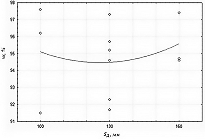 Показатели качества работы сепарирующей системы свидетельствуют о достижении полноты сепарации товарной продукции 95,8% при нахождении оптимальных значений поступательной скорости движения пруткового элеватора vД =1,6 м/с и расстояния между ним и дефлектором SД =160 мм (рис. 5).