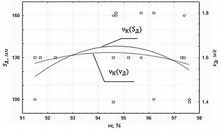 График на рисунке 7 отображает корреляционную зависимость качественных показателей (νК) уборки клубней картофеля от исследуемых технологических параметров сепарирующей системы SД и vД, которая выражается уравнением параболических функций: