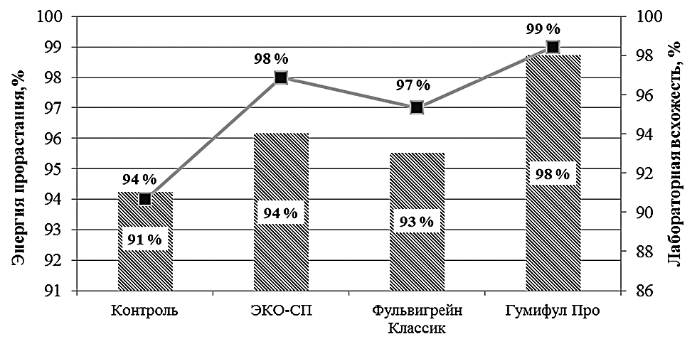 Рис. 1. Влияние обработки семян гуминовыми препаратами на энергию прорастания и лабораторную всхожесть семян ярового ячменя (НСР05 для энергии прорастания – 1,5 %, для лабораторной всхожести – 1,1 %): ⛆ – энергия прорастания, %,-■- – лабораторная всхожесть, %.