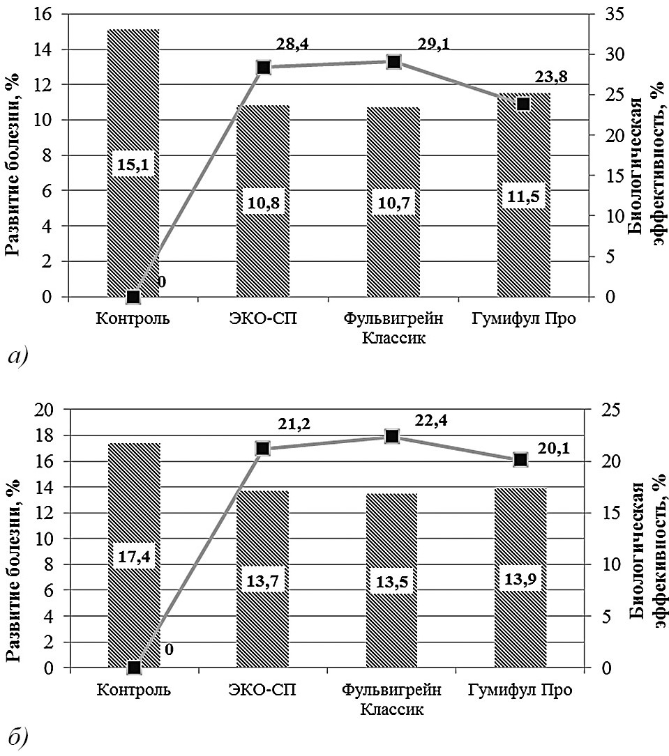 Рис. 2. Влияние гуминовых удобрений на развитие ринхоспориоза (а) и гельминтоспориоза (б) в посевах ярового ячменя (среднее за 2020–2022 гг., НСР05 для ринхоспориоза – 1,4 %, для гельминтоспориоза – 1,8 %): ⛆ – развитие болезни, %, -■- – биологическая эффективность, %.