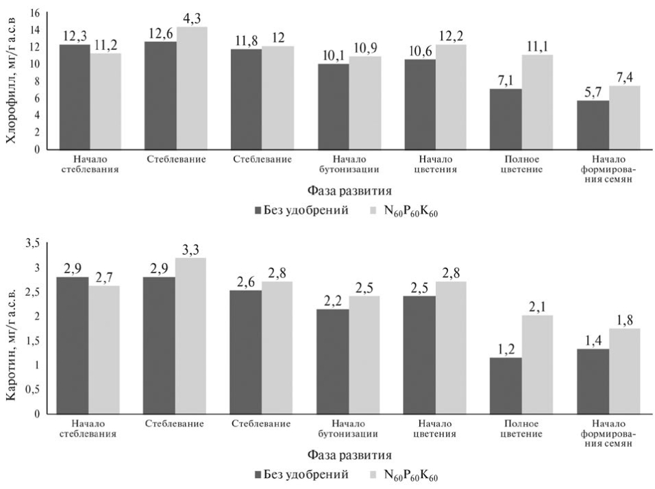Уровень минерального питания растений влияет на содержание фотосинтетических пигментов и вследствие этого на интенсивность фотосинтеза и аккумуляцию СО₂. Проведенные в полевых условиях исследования на клевере луговом и яровой пшенице выявили несущественные различия между содержанием хлорофилла и каротина в вариантах с внесением минеральных удобрений и без их использования, что связано с засушливым периодом вегетации культур и последействием удобрений на клевере.