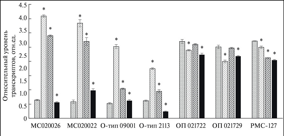 Ген OSM, участвующий в реакции на возбудителей болезней, предположительно, наряду с геном MsIC, может участвовать в механизме адаптации сахарной свеклы к абиотическому стрессу [16]. У всех образцов, обработанных солевым раствором, его экспрессия гена была ниже либо на уровне контроля (рис. 4). Следовательно, можно предположить, что у изученных генотипов сахарной свеклы ген OSM не участвует в адаптации к солевому стрессу.