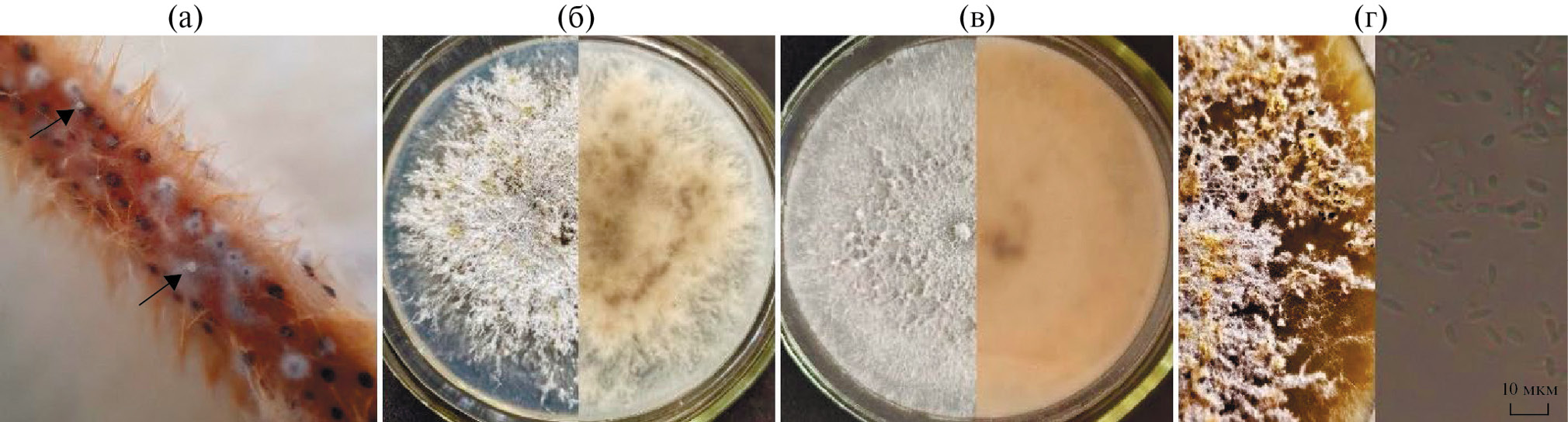 Рис. 1. Морфологические признаки Diaporthe sp.-1: а) спорулирующие пикниды на стебле сои; б) колония / реверс на среде Чапека, 21-е сутки; в) колония / реверс на среде PDA, 21-е сутки; г) колония с пикнидами на среде Чапека после УФ-облучения, 35-е сутки / α-конидии.