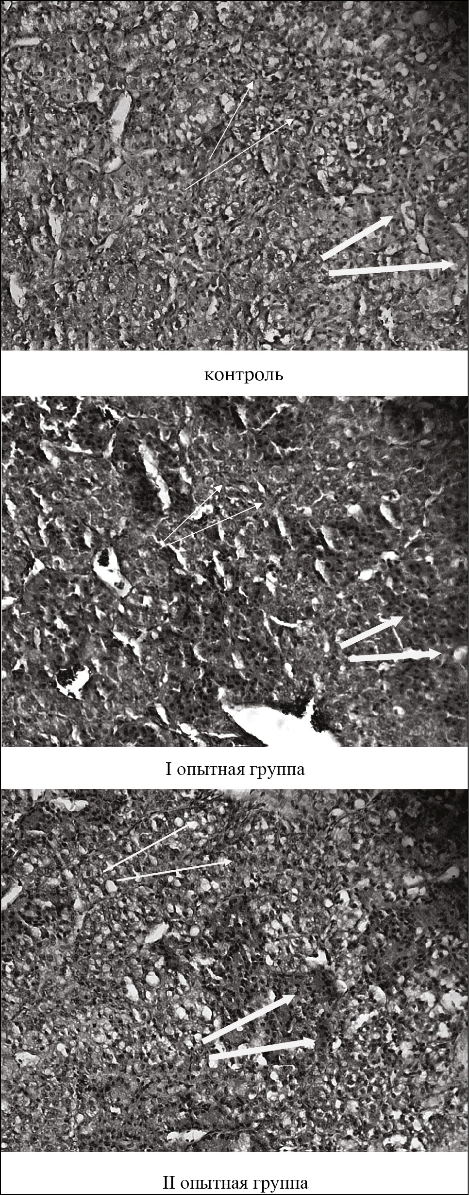 Надпочечник цыплят-бройлеров опытных групп располагались в грудобрюшной полости на уровне первых поясничных позвонков, по бокам от аорты на медиовентральной поверхности передней доли почек, имели неправильную треугольную форму, серовато-желтый цвет или цвет охры, у самок левый надпочечник прикрывал яичник. Снаружи надпочечники были покрыты капсулой из соединительной ткани, паренхима их четко не разделялась на корковое и мозговое вещество. Клетки коркового и мозгового вещества образовывали переплетающиеся между собой кортикальные и медуллярные тяжи, преобладали клетки кортикальных тяжей [28, 29]. Последние, в основном имели многогранную форму, формировали по два, три ряда, чаще на периферии органа (рис. 3).