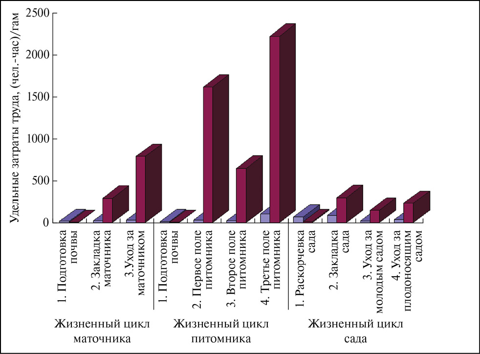 Рис 1. Удельная трудоемкость технологических операций в промышленном садоводстве: – механизированный труд; – ручной труд