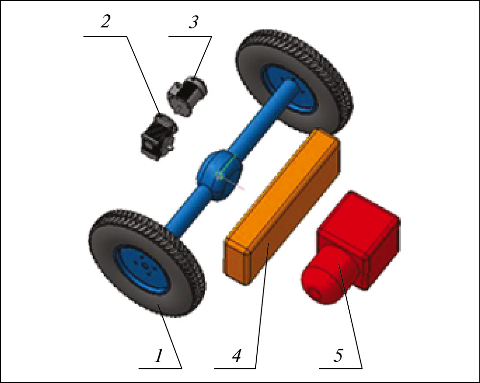 Рис. 4. Базовая комплектация энергетических модулей электроприводного типа изделий «бестракторного земледелия»: 1 – портальный мост; 2 – понижающий редуктор; 3 – низковольтный бесколлекторный электродвигатель с системой управления; 4 – комплект аккумуляторных батарей; 5 – ДВС-генератор