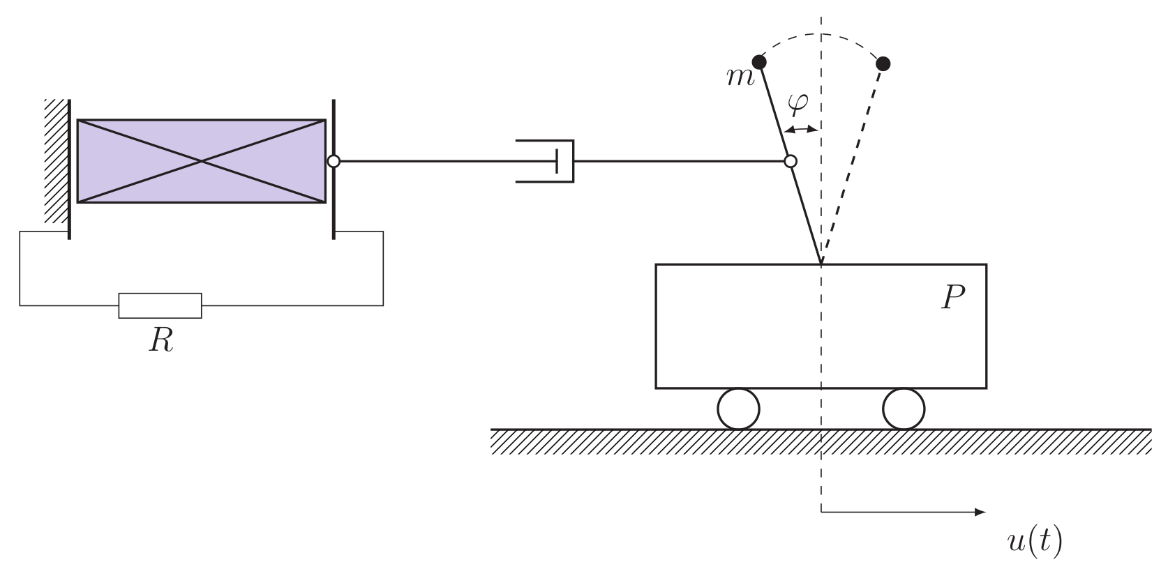 Модель изучаемой системы состоит из перевернутого математического маятника, закрепленного на легкой горизонтальной платформе и соединенного механической связью с сегнетоэлектрическим конденсатором, который включен в замкнутую электрическую цепь. Платформа P может перемещаться в горизонтальном направлении. Обозначим угол отклонения маятника относительно вертикали через φ(t), координату платформы — через u(t) (рис. 1.1). Длина маятника равна l, масса его груза равна m. Связь между механической и электрической подсистемами содержит звено, подчиняющееся закону вязкого тре- ния с коэффициентом диссипации c [соответствующая сила трения равна Ffr = cv(t) = (lφ/2 + u)].].