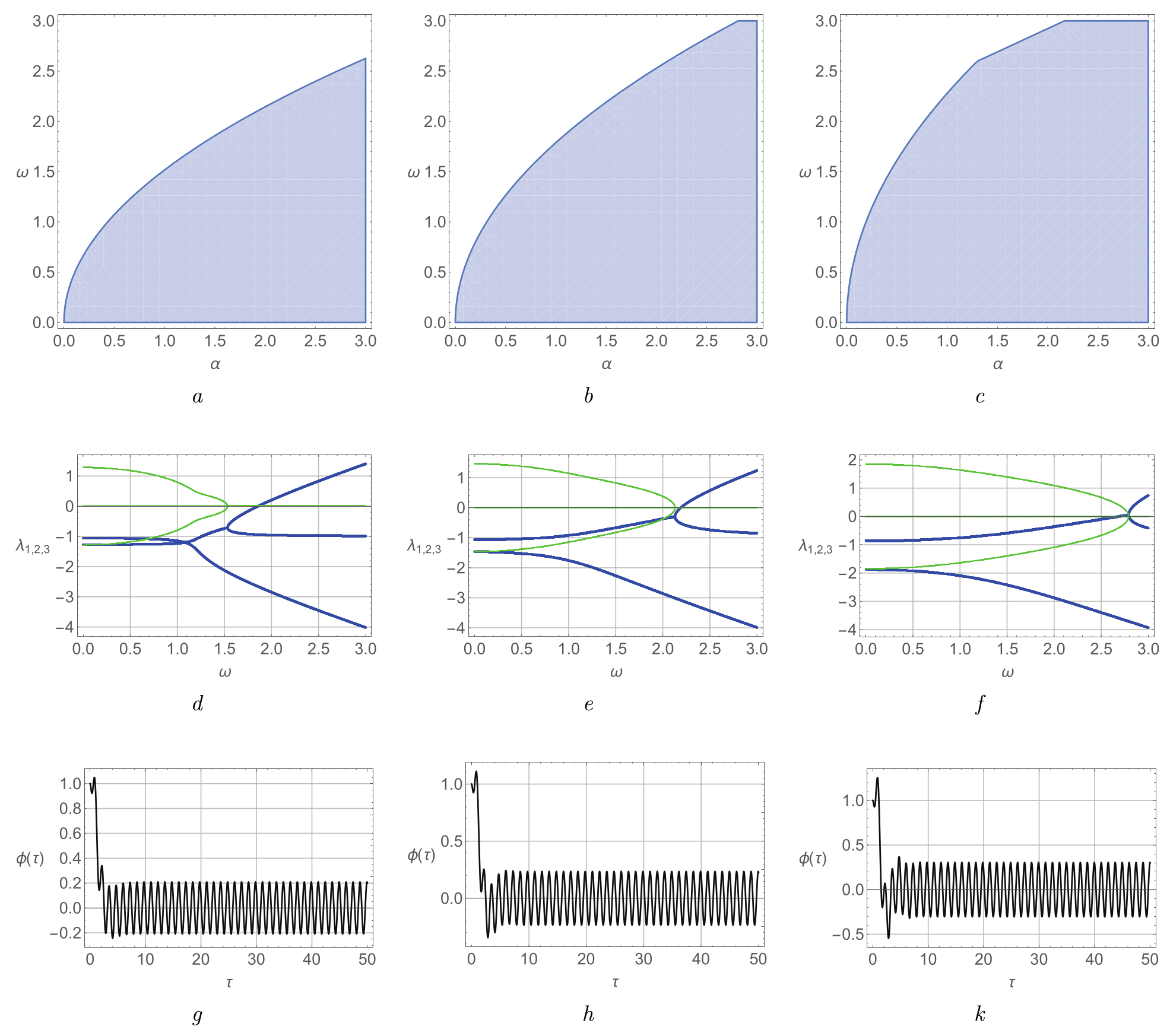 Рис. 1.2. Результаты численных расчетов области устойчивости (1.22), корней характеристического уравнения и решения (1.22) при γ = 0,2, α = 0,4. Параметры и начальные условия для угла отклонения ω = 0,4, d = 1,0, Ω = 5,0, φ(0) = 1.0, ψ(0) = 0.0, v(0) = 1.0: a — область устойчивости для σ = 0,05; b — область устойчивости для σ = 0,5; с — область устойчивости для σ = 1,5; d — вещественные (толстые линии) и мнимые части (тонкие линии) корней характеристического уравнения для σ = 0,05; e — вещественные (толстые линии) и мнимые части (тонкие линии) корней характеристического уравнения для σ = 0,5; f — вещественные (толстые линии) и мнимые части (тонкие линии) корней характеристического уравнения для σ = 1,5; g — угол отклонения маятника для σ = 0,05; h — угол отклонения маятника для σ = 0,5; k — угол отклонения маятника для σ = 1,5