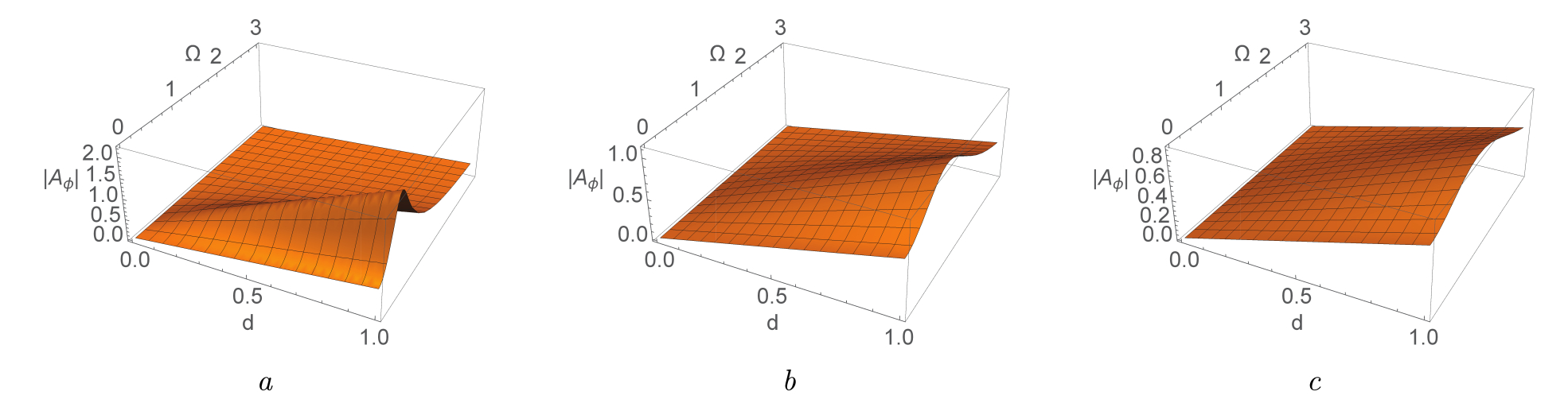 Графики зависимости амплитуды вынужденных колебаний маятника |Aφ| в пространстве параметров {(d, Ω)} представлены на рис. 1.4–1.5. На этих рисунках видны убывание максимальной амплитуды с увеличением γ, а также смещение резонансной области в сторону больших частот Ω в этом случае. В силу линейности системы (1.30) величина |Aφ| пропорциональна параметру d в управляющей функции .