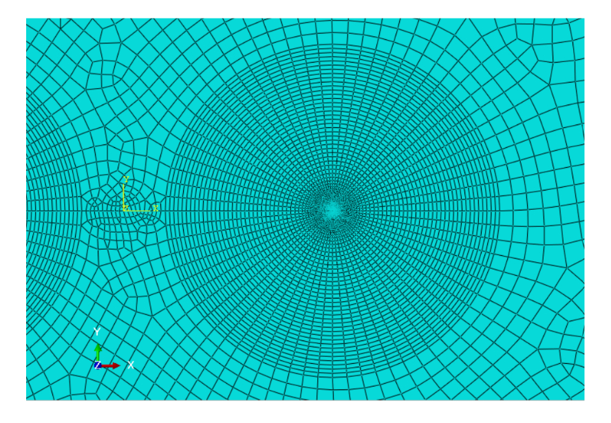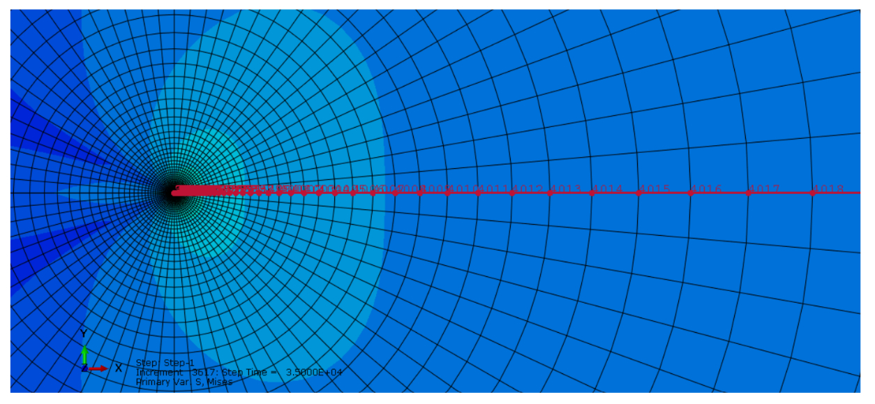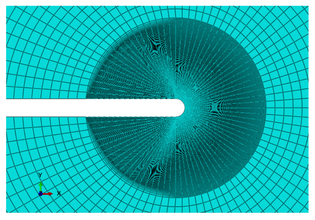 Сетка в окрестности вершины трещины построена с использованием сингулярных конечных элементов. Концентрические окружности поделены на три области: перед вершиной дуга окружности величиной разбита на 36 секторов, таким образом, раствор секторального элемента равен , две другие части поделены на 17 секторов. Тип элементов сетки был избран CPS4. Полученная конечно-элементная сетка представлена на рис. 4.