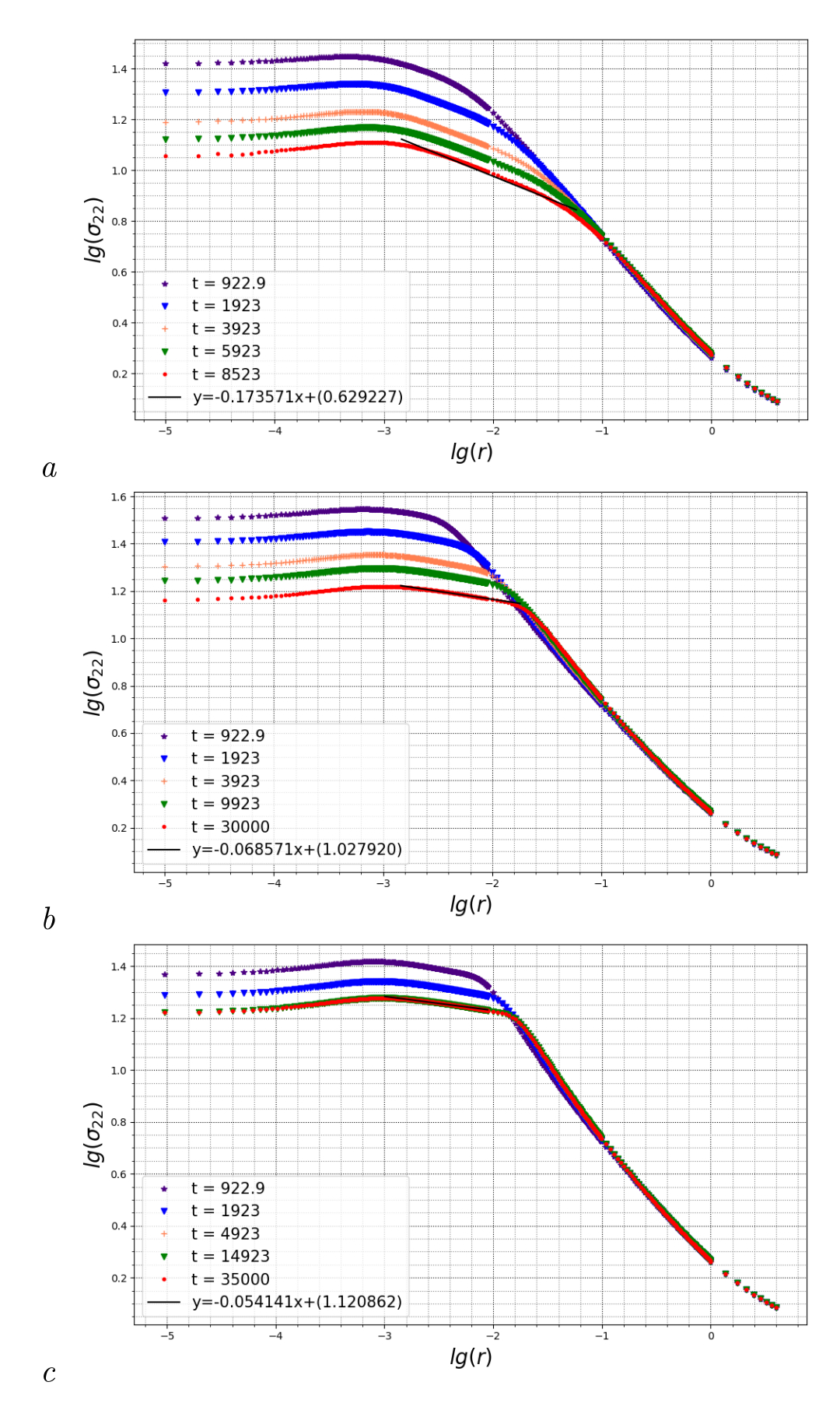 Для каждого графика на рис. 4 построена прямая черная линия, аппроксимирующая значения компоненты тензора напряжений в последний момент времени в зоне ползучести. Полученные значения коэффициента наклона этих прямых соответствуют значениям, полученным из соотношения . Линия, аппроксимирующая значения компоненты тензора напряжений в зоне упругости, имеет при этом коэффициент наклона равный , что также соответствует аналитическому решению. Это показывает, что асимптотическое решение ХРР присутствует в расчетах для острой трещины.