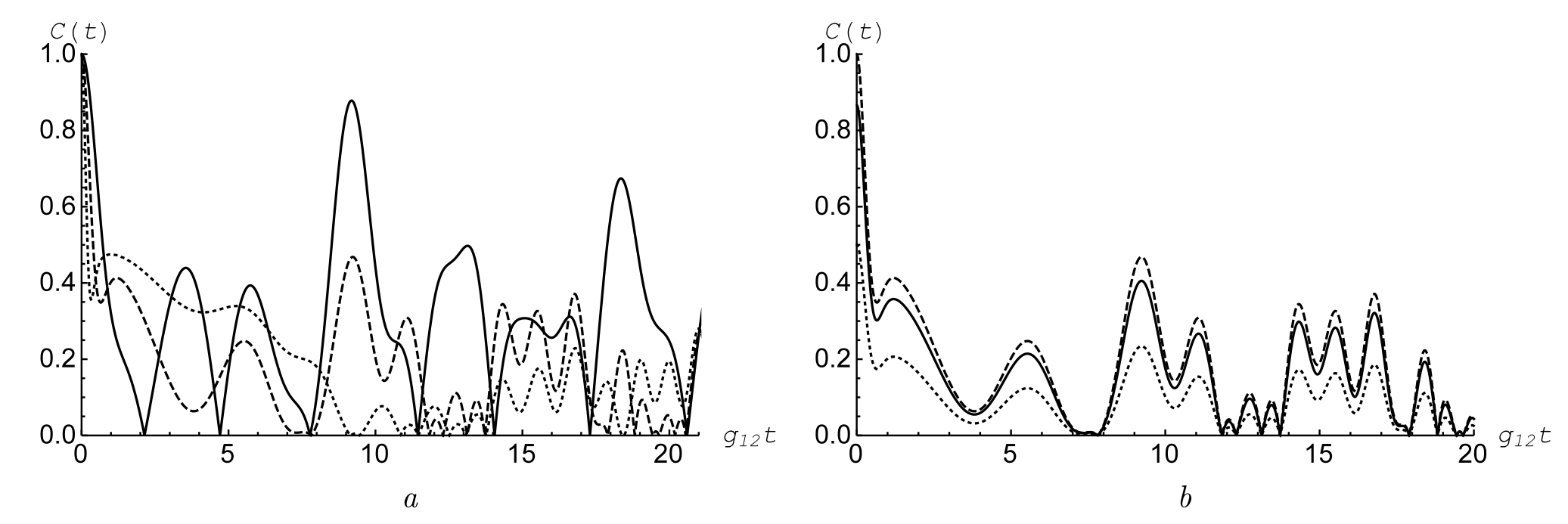 Рис. 2. Зависимость согласованности C(t) от приведенного времени g12t для перепутанного начального состояния кубитов 1/√2(|+, +⟩ + |−, −⟩) и когерентного состояния микроволнового поля. Случай (a) соответствует коротким приведенным временам. Среднее число фотонов ̅n = 30. Параметр ϕ = 0 (сплошная линия), ϕ = π/4 (штриховая линия) и ϕ = π/2 (точечная линия). Случай (b) соответствует длинным приведенным временам. Среднее число фотонов ̅n = 10 (сплошная линия), ̅n = 30 (штриховая линия) и ̅n = 60 (точечная линия)