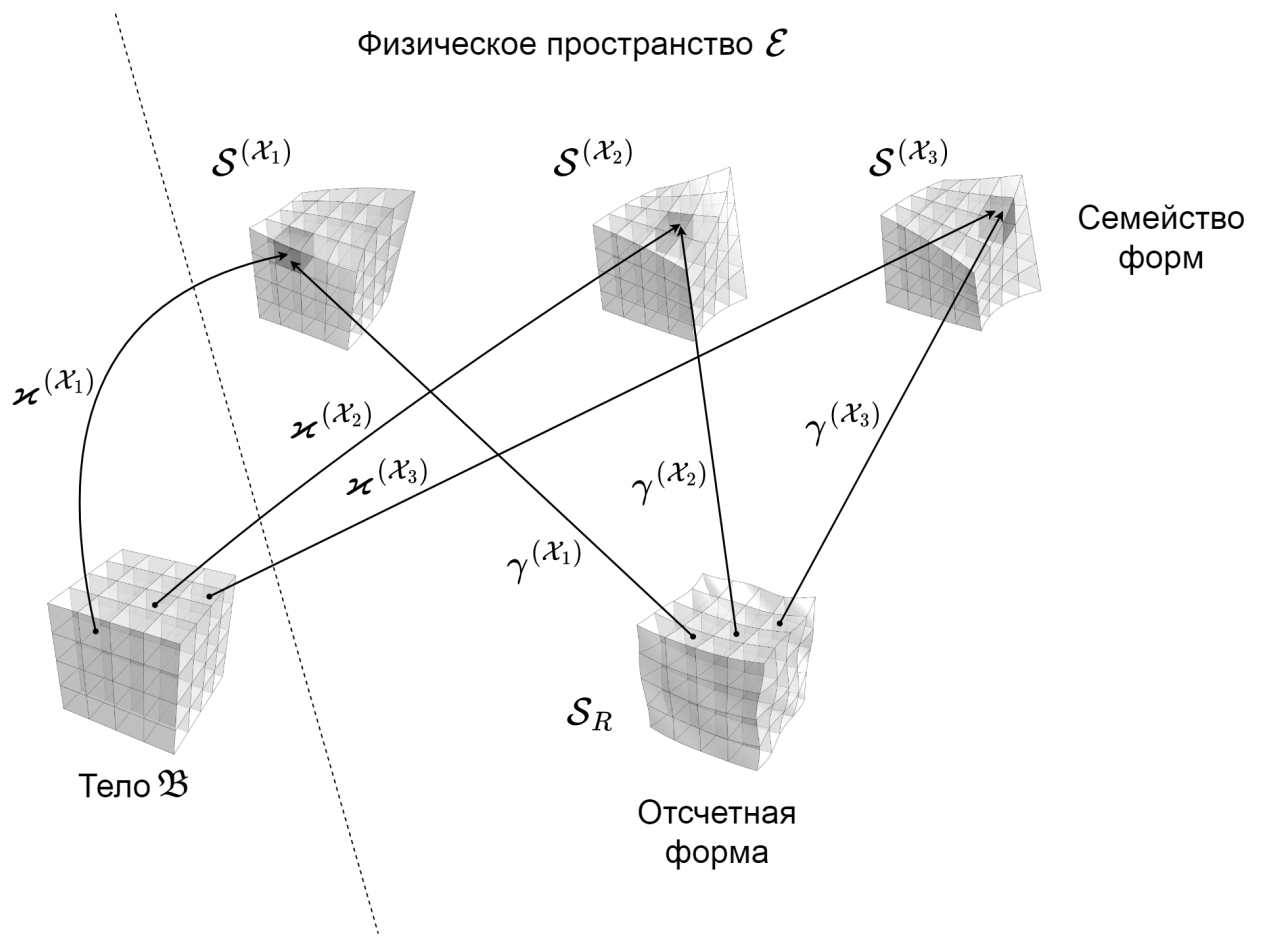 Пусть произвольные конфигурации, образами которых являются евклидовы формы и . Определим отображения и . Тогда композиция характеризует переход от формы к форме и в этой связи называется деформацией. Соотношения между телом и его формами, конфигурациями и деформациями иллюстрируются на рис. 1.