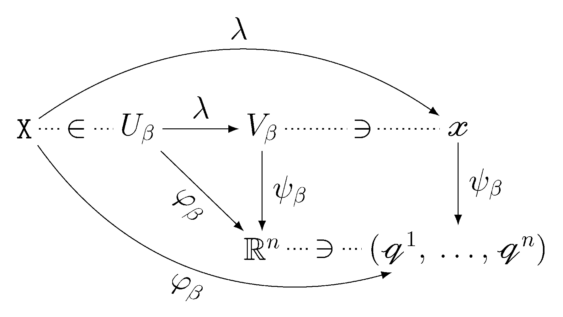Тогда открытое множество, семейство образует покрытие , а гомеоморфизм. Следовательно, совокупность является гладким атласом на . Это означает, что точки из и характеризуются одинаковыми координатами . Рисунок 4 иллюстрирует идею такой арифметизации .
