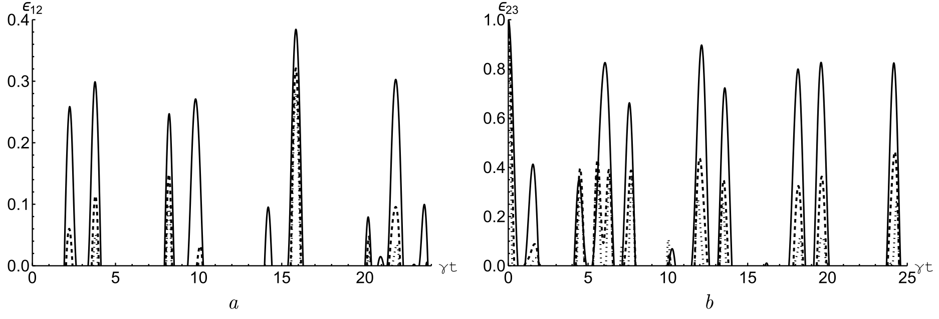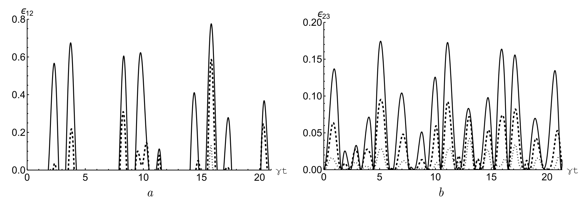 Рис.2: Зависимость отрицательностей ε12 (а) и ε23 (b) от приведенного времени γt для начального состояния кубитов |+,-,-⟩. Среднее число тепловых фотонов в моде ¯n=0.1 (сплошная линия), ¯n=1 (штриховая линия) и ¯n=4 (пунктирная линия)