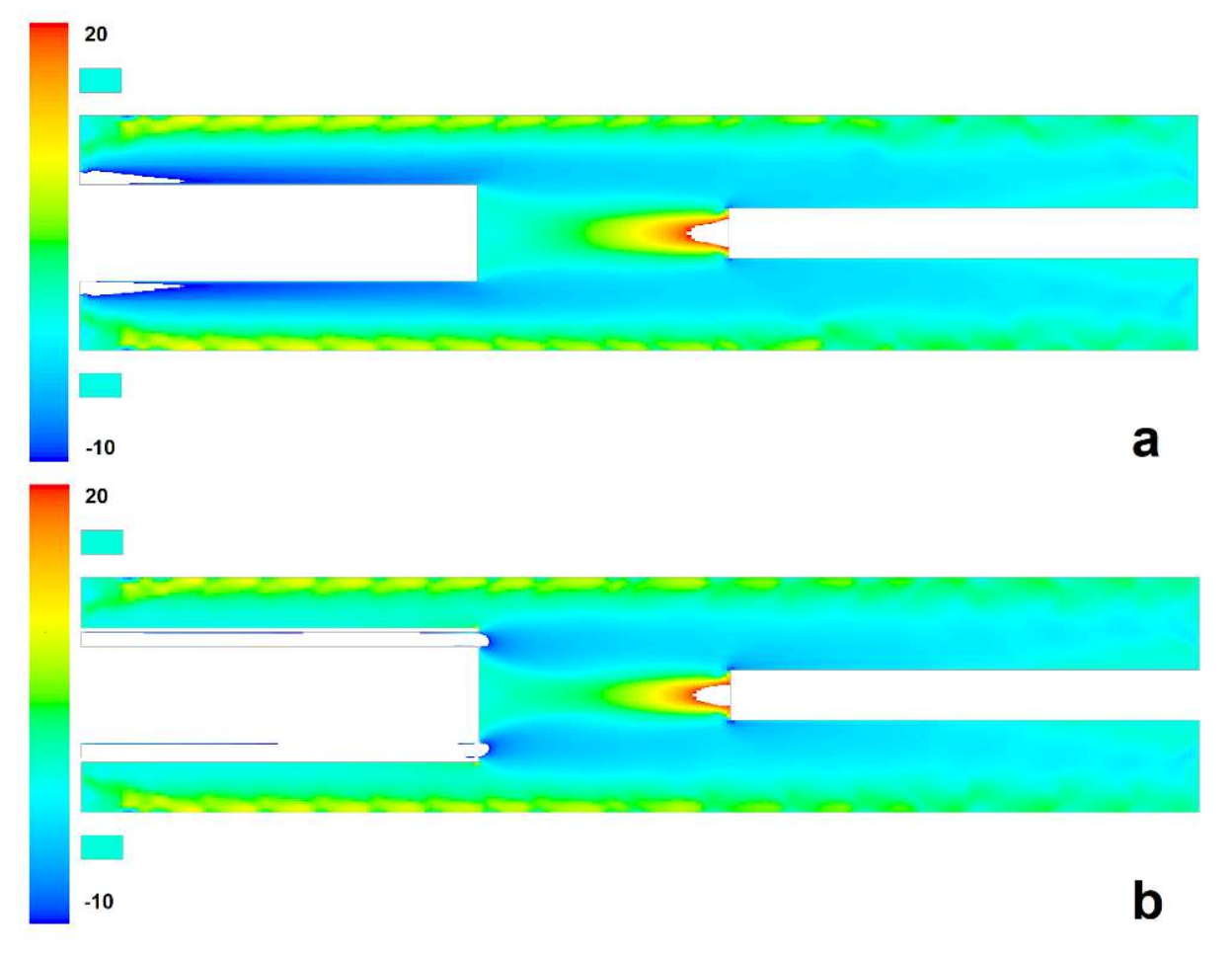 Axial velocity profiles of interest are shown in Fig. 2 and 3. Limited velocity ranges are used in order to make pictures more contrast and highlight areas of negative values. For both realizations, with (b) and without (a) additional bounding tube, there is pronounced counterflow which can suck out hot gas and reaction products from the interelectrode zone. However, absolute values of axial velocity in that area when only primary outlet is open are relatively low which could lead to overheating and exceeding limits or the used model. In the case of open secondary outlet (Fig. 2), there is direct flow sufficient to keep temperatures in computationally allowed range (Fig. 3).
