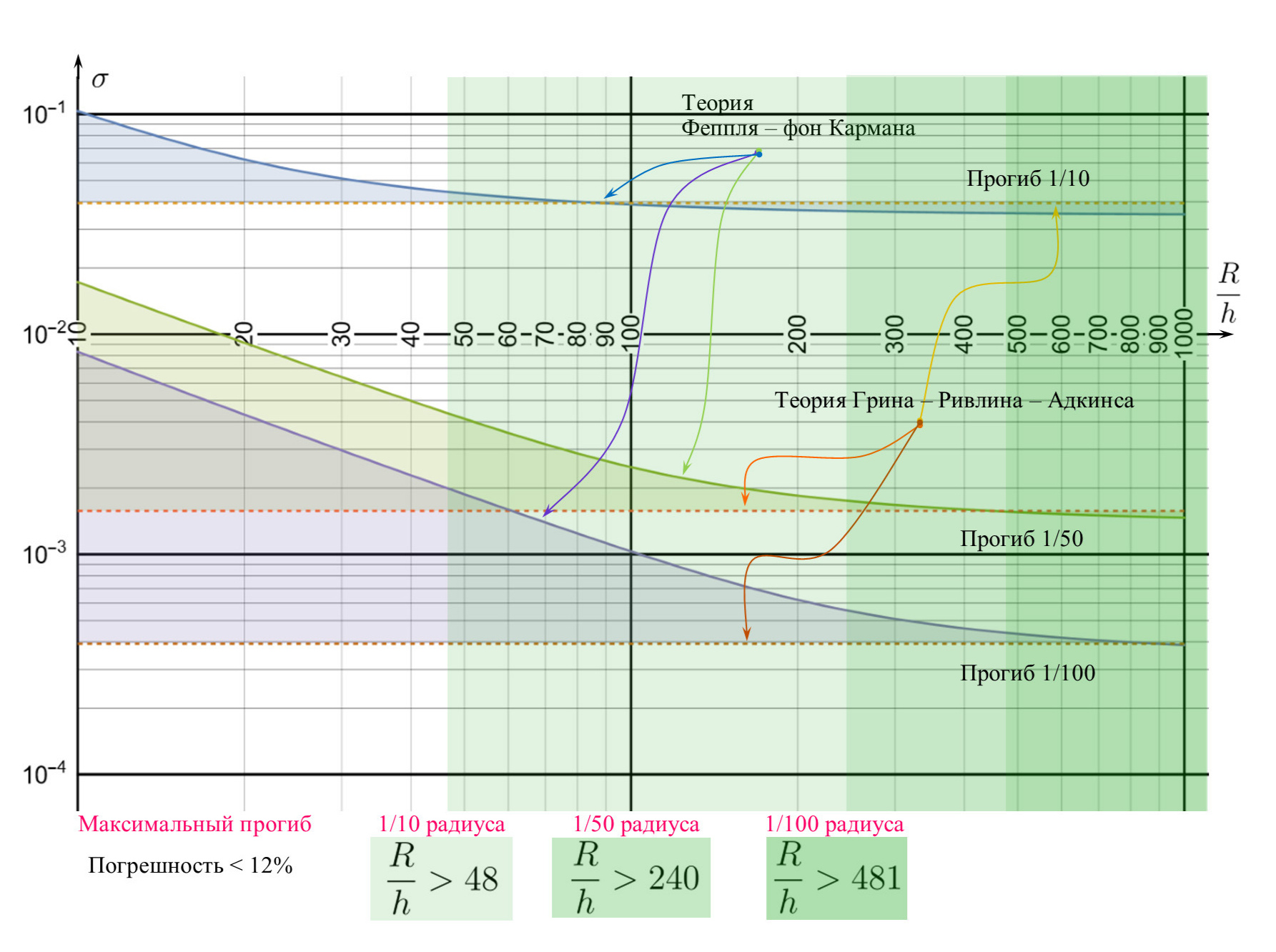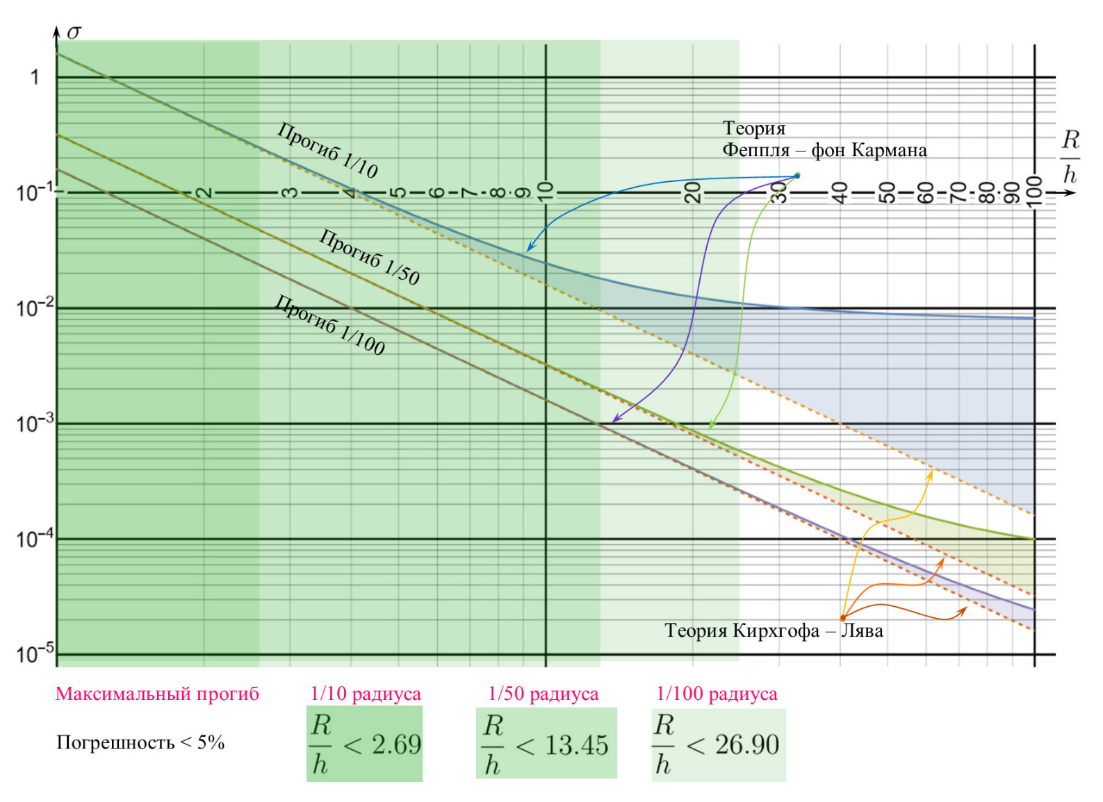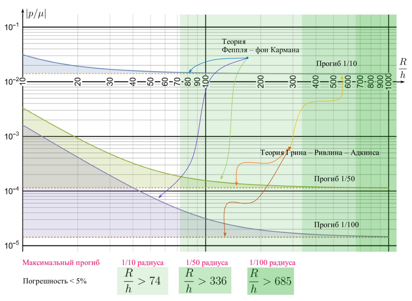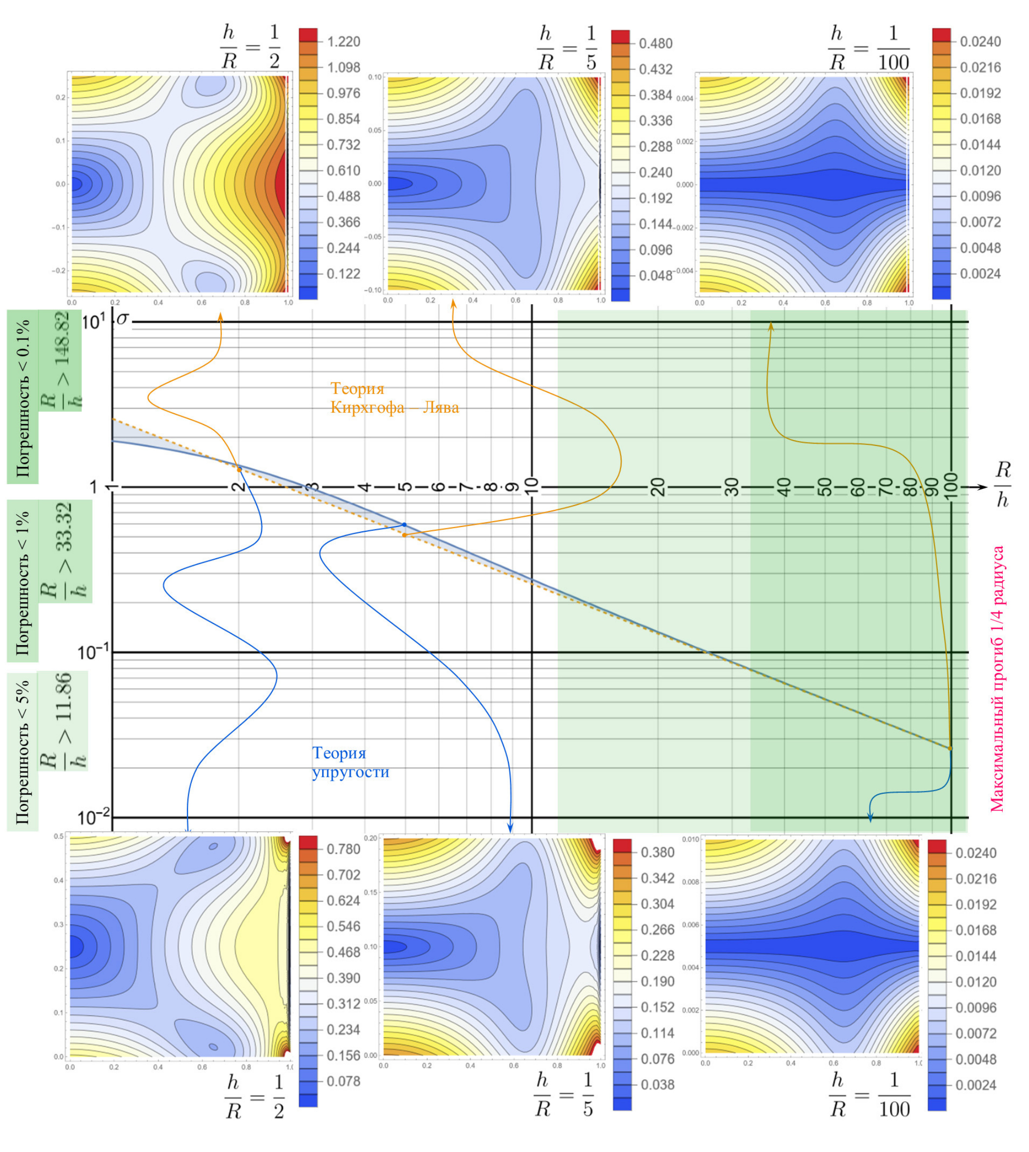 На основании сопоставления результатов расчетов можно определить области параметров, в которых каждая из рассматриваемых моделей адекватно описывает НДС изгибаемой пластины. Для уровня погрешности 5 % относительные толщины, при которых может быть использована теория Кирхгофа-Лява, находятся в интервале от 1/10 до 1/30 (при максимальном прогибе 1/100 радиуса). В интервале от 1/30 до 1/480 может быть использована теория Феппля-фон Кармана, а при меньших значениях отношения толщины к радиусу — теория Грина-Ривлина-Адкинса.