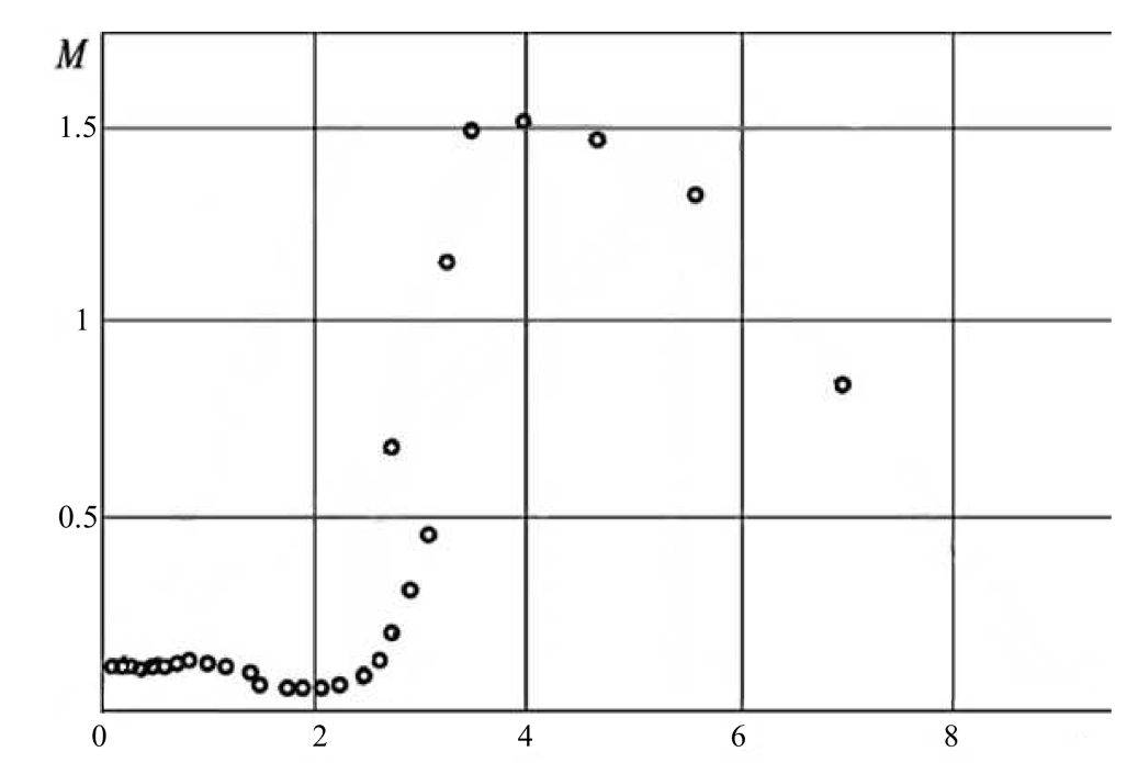 Рассмотрим график экспериментальных данных , изображенный на рис. 2.1. Относительный момент аэродинамических сил и коэффициент быстроходности на рис. 2.1 являются безразмерными (, , где — угловая скорость, — расстояние от эффективного давления лопастей для оси вращения, — скорость воздуха, — момент аэродинамических сил, — плотность воздуха, — площадь лопастей) [3; 5; 7]. Для построения функции зададим ее как кусочно-линейную функцию по промежуткам: