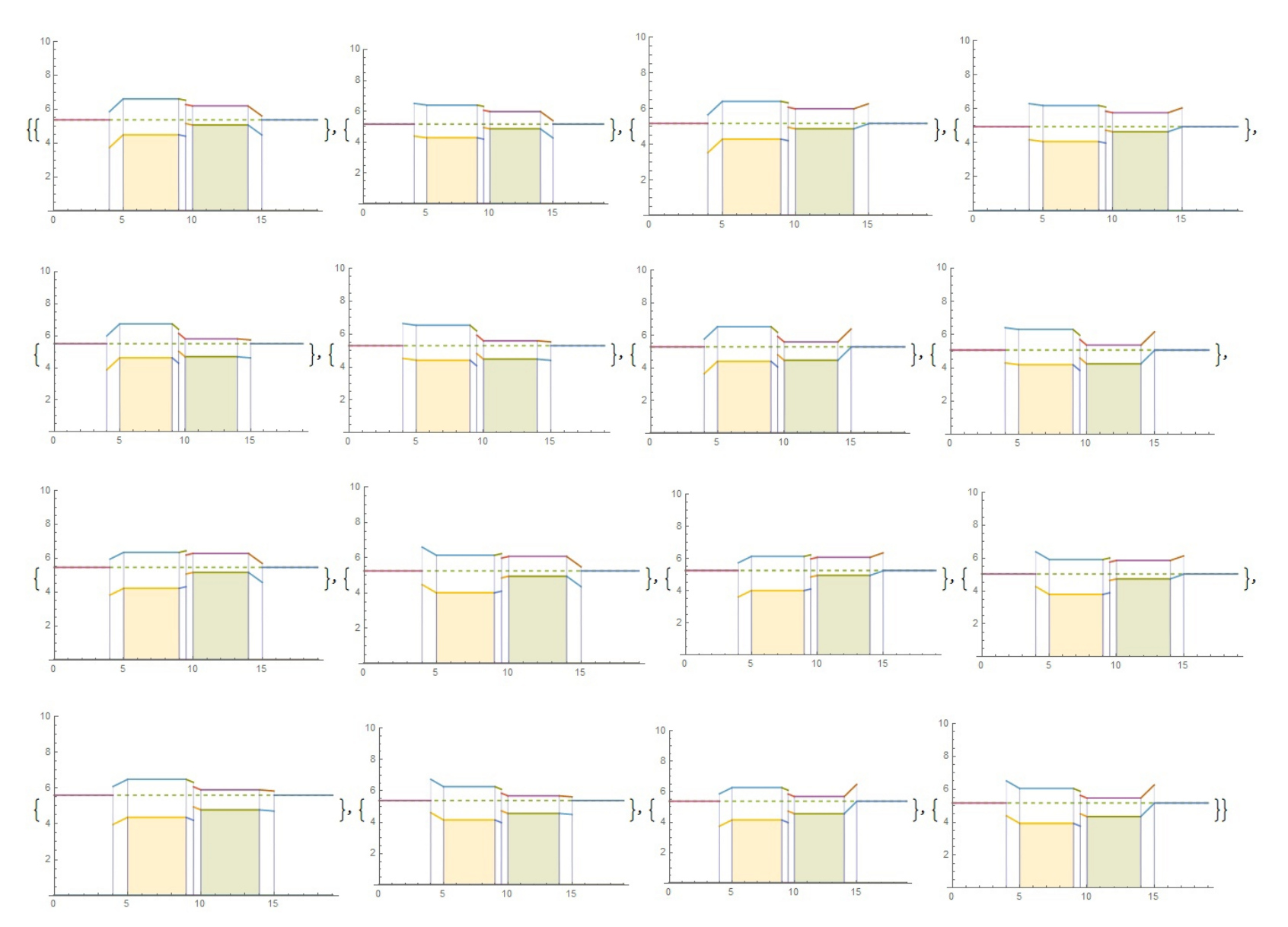 На рис. 3.2 приведен пример 16 диаграмм, соответствующих двум типам легирования карбида кремния и кремния в гетероструктурах (изотипных и анизотипных) и двум контактным материалам с различной работой выхода, больше и меньше, чем у кремния и карбида кремния (таблица с учетом механического напряжения). Выборка удобно позволяет определить качественно последовательность гетероперехода и металлизации с большими разделением электрон-дырочных пар и потоком заряда.