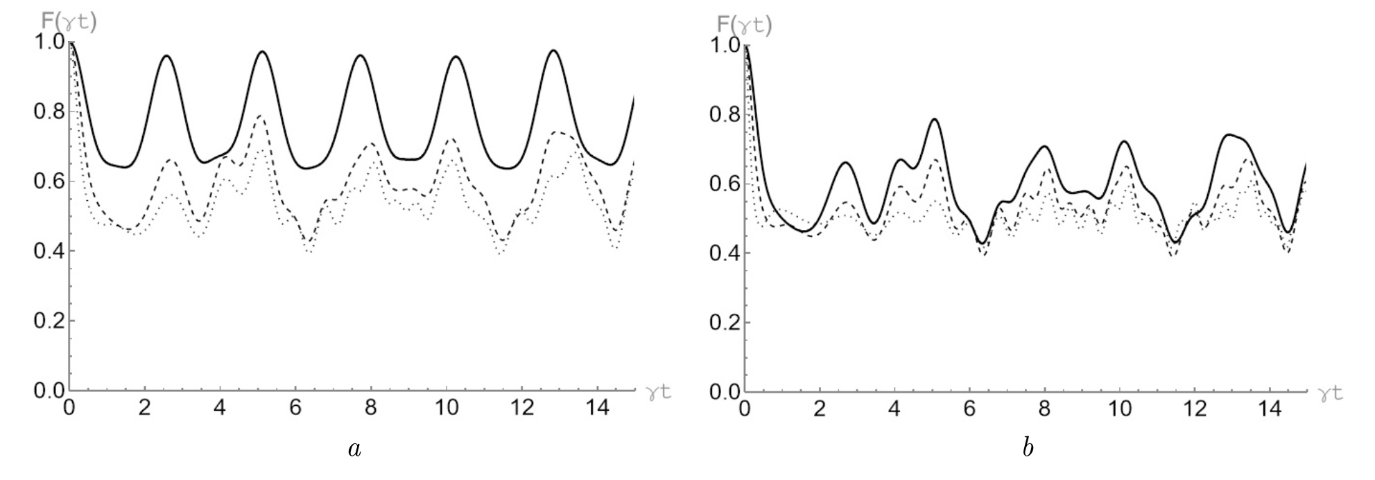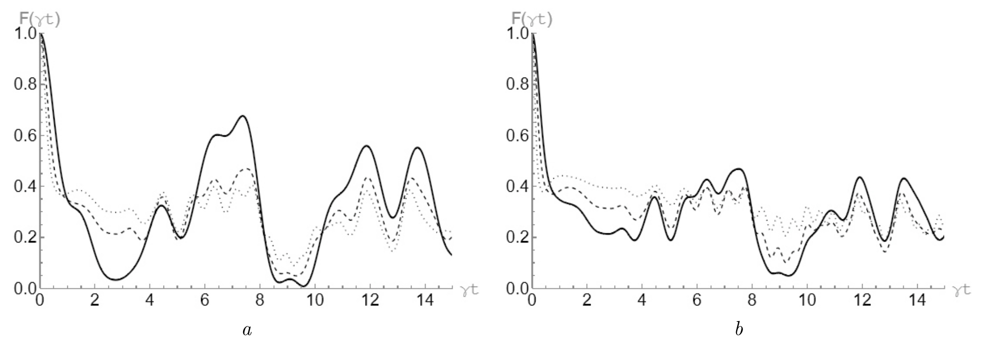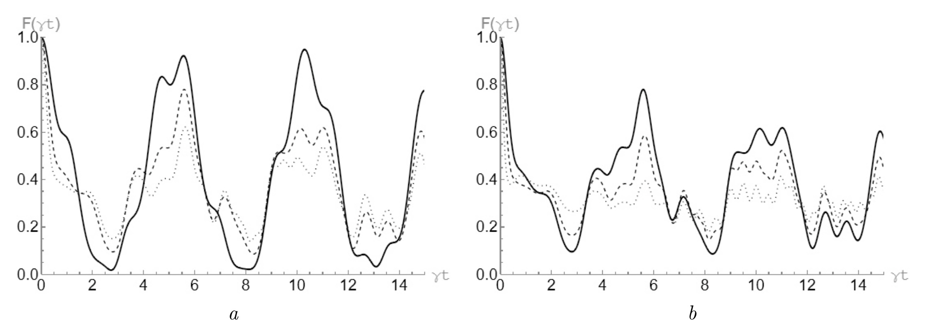 Рис. 1: График зависимости параметра степени совпадения от приведенного времени для начального GHZ-состояния вида (2) с для различных средних чисел тепловых фотонов : (сплошная линия), (пунктирная линия), (точечная линия) ( a); (сплошная линия), (пунктирная линия), (точечная линия) ( b)