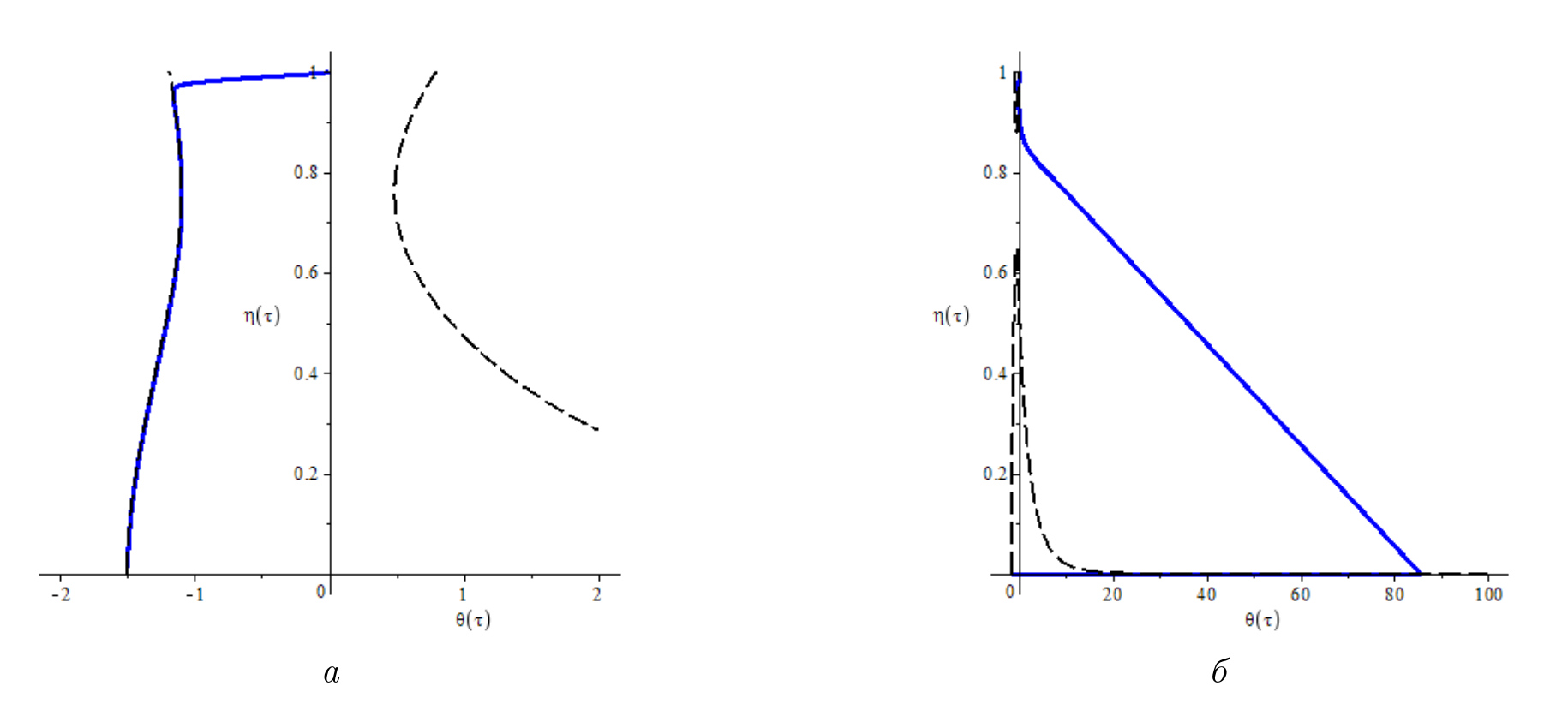 Fig. 2.1. Slow curve (dotted line) and trajectory (solid line) of the system (3)–(4), constructed with the following parameter values: γ=0,01; β=0,01; η0=0,9; ξ0=0,9; θamb=-1,5; а — α=0,7; б — α=0,5