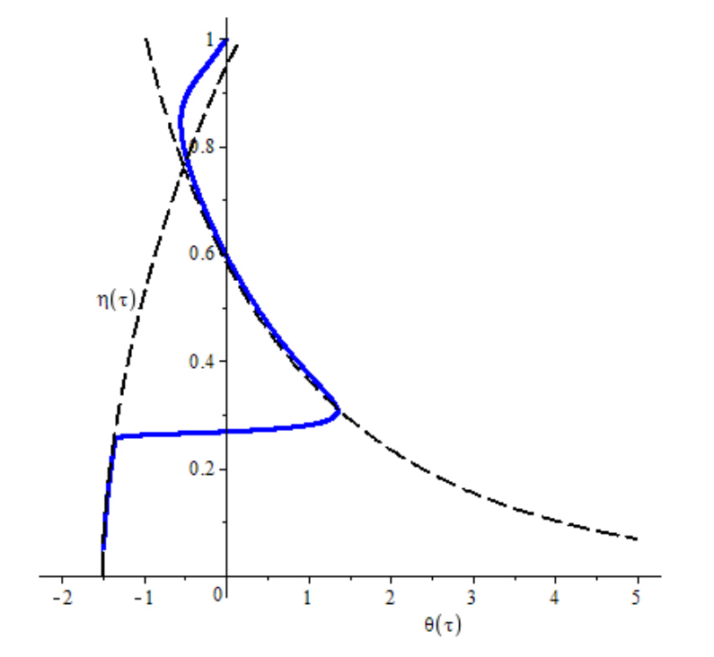 Рис. 2.2. Медленная кривая (пунктирная линия) и траектория (сплошная линия) системы (3)–(4), построенные при следующих значениях параметров: γ=0,01; β=0,01; η0=0,9; ξ0=0,9; θamb=-1,5; α=0,50796334626.